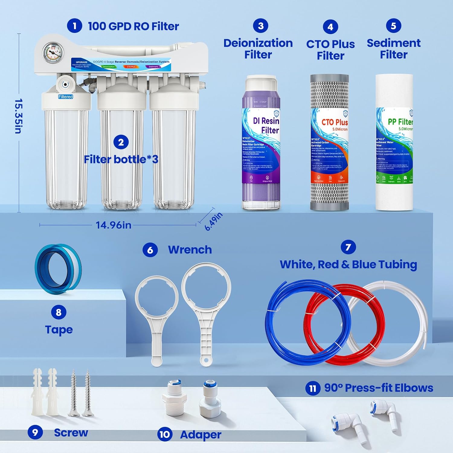 • Package Includes - 100 GPD RO Filter*1,Sediment Filter*1,CTO Plus Filter*1,Deionization Filter*1,Filter housing*1,White Tubing*1, Red Tubing *1 ,Blue Tubing*1,Screw*2,Tape*1,Wrench*2,Adaper*2,90° Press-fit Elbows*2, user manual*1