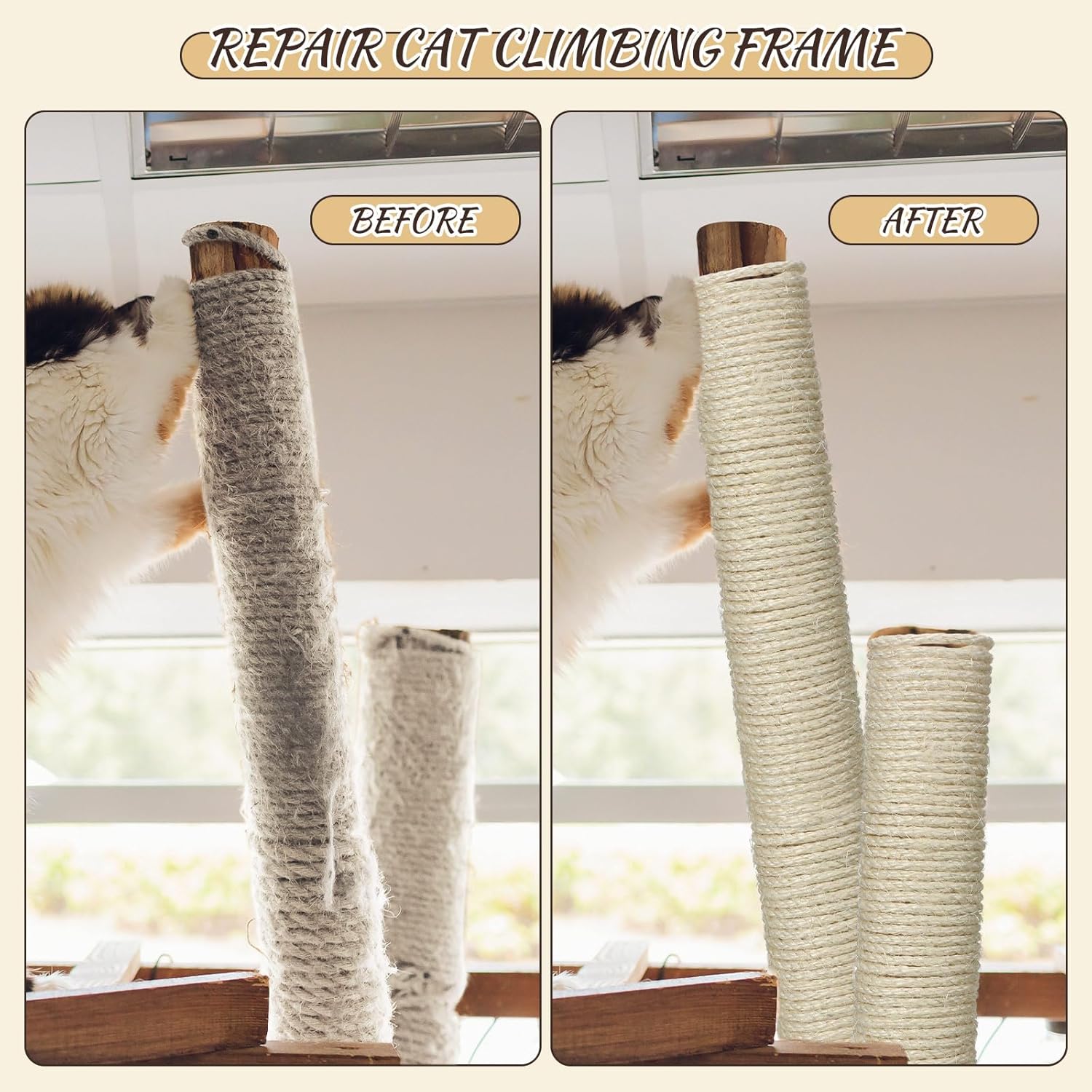 Features: The cat tree rope replacement offering can serve as a thoughtful gift for family, friends, or loved ones who have cats at home. They will appreciate your thoughtful gesture in enhancing their pets' life. The cat scratching rope will bring cats enhanced fun, keeping them engaged in play and encouraging healthy scratching. It's an exciting addition to cat's life, promoting their physical well being and mental enrichment. Specifications: Main material: sisal Color: white Size: about 1/4 inch in diameter, and about 200 ft in length per rope Package includes: 2 Bundles of twine for cat scratching post Notes: Manual measurement, please allow slight errors on size. The color may exist a slight difference due to different screen displays. Winding risk may exist, please keep our product away from children.