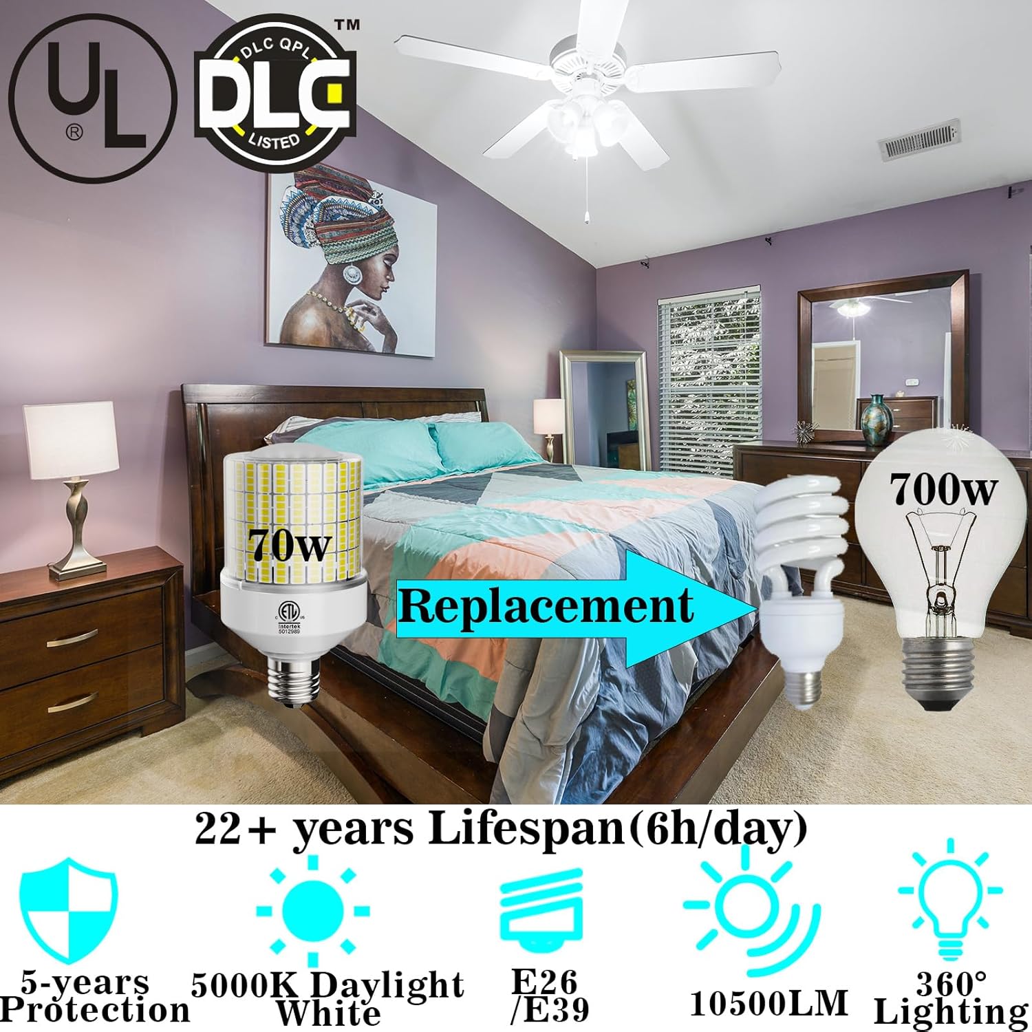 | Additional Features | Eye-Friendly, Free E39 Base converter,Suitable for AC 100v-277v E39 and E26 base, Instant On, Lightweight, Long Lasting |
