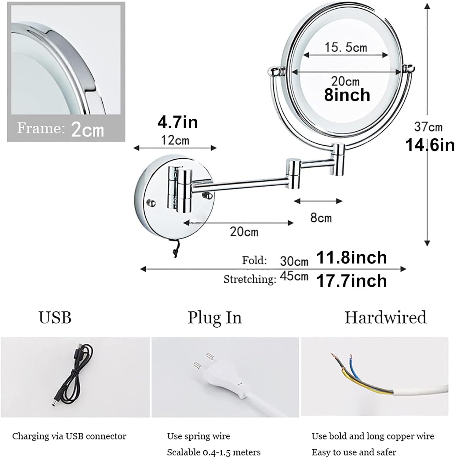 We specialize in vanity mirrors, we care about the quality of mirrors. We always choose high-quality metal brackets and glass mirrors, and adopt advanced multi-layer electroplating anti-rust technology to make our vanity mirrors rust-free and anti-corrosion.If you need other colors or magnification mirrors, please contact our customer service before payment.Item Type: LED Lighted Makeup MirrorType: Adjustable Wall Mounted Shaving Vanity MirrorColor: Chrome, Brass, Gold, Rose Gold, Nickel, Black, Brushed Gold, Gun GrayInput voltage: AC: 85~265VLighted: YesMaterial: Brass + Stainless steel + GlassFeature: lilluminated, 2-face, magnifying, dual arm extend, touch dimmable 360 Degree Rotated Mirror: Easy to adjust the angle you wantDouble sided: Normal and 3X/5X/7X/10X MagnifyingShape: RoundMirror Size: 8 Inches (20cm)Telescopic Range: 26.5cm-45cmSwitch: Base touch switchPower Supply Mode: Hard-Wired (5W), Plug-In (5W), USB Charging (3.5W)-2600mahInstallation Method: Wall-MountedLED Quantity: 42PCSLED Life: 10,000 HoursLight Luminance: 6,500KWarm reminder:The project may be slightly different from the image due to the display of lights and screens.To get a real image, avoid picture distortion and inversion, the distance between you and the mirror should not exceed:30cm(3X); 20cm(5X); 15cm(7X); 10cm(10X)