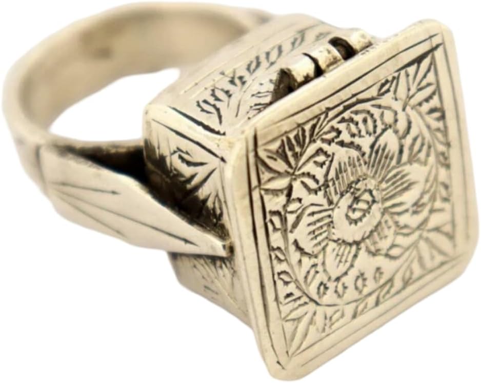 Discover the allure of this intricately handcrafted 925 Sterling Silver poison ring, a unique piece that combines mystery with elegant design. This distinctive ring features a clever hidden compartment beneath its decorative top, perfect for storing small treasures or meaningful keepsakes. The secret box design pays homage to historical rings that were once popular among nobility. Crafted from genuine sterling silver, this locket ring showcases fine metalwork and attention to detail. The hidden compartment opens smoothly to reveal its secret space, while maintaining a sophisticated appearance on the outside. This versatile piece works beautifully as a conversation starter or a distinctive addition to your jewelry collection. Each ring represents the skilled craftsmanship of artisans who carefully shape and detail the silver into this functional piece of wearable art.