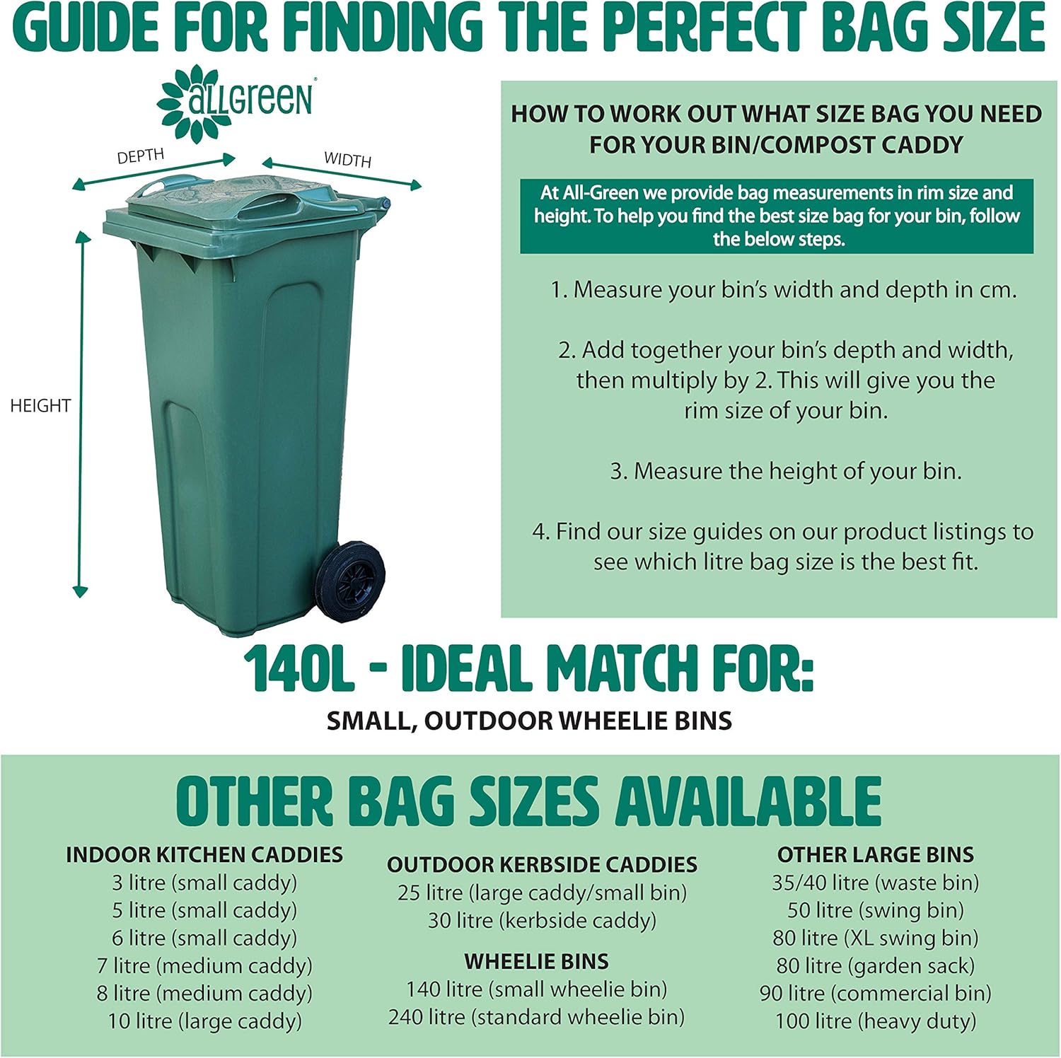Product Description 140 litre Compostable Wheelie Bin Sacks Supplied with Composting Guide/Compost Bin Construction Guide (Produced by All-Green)Contents: 10 bags - Corn starch, compostable liners as approved by Local Authorities for use in Waste recycling schemes. Bag size: 140 litre - Approx. 174cm rim x 132cm length with gathered base What are they designed for These Bio bags are designed to fit the smaller 140 litre wheelie bins. More info. All the Bio Bags are certified biodegradable and compostable according to the European standard for compostable packaging; EN 13432, which is the internationally recognized standard for compostable and biodegradable bags in Europe. They are printed with the internationally used CROSS PATTERN and have the COMPOSTABLE PACKAGING LOGO showing that the bags are certified according to EN-13432. Set Contains: 1x roll of compostable bags - 10 bags per roll Composting Guide/Compost Bin Construction Guide (Produced by All-Green)