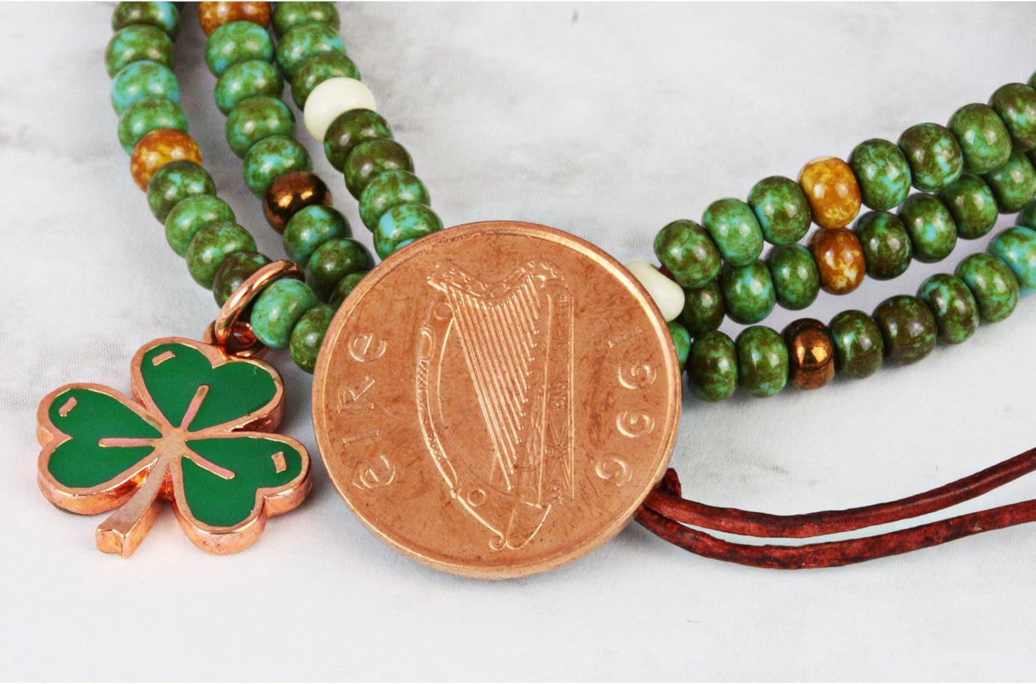 Are you looking for a great keepsake gift or a vintage collectible that you can wear and show it to the crowd! Look no further! ❤ American Coin Treasures’ Irish Penny Coin Multi Strand Bracelet brings back the spirit of the Celtic Irish into the modern world. Why choose our Irish Penny Coin Bracelet? ❶ The Irish one cent coin features the harp, the National Symbol of Ireland, the historic coin is complemented by a green enamel shamrock for a look that will definitely last a lifetime. ❷ This Irish Penny Coin Bracelet features a genuine Irish one cent coin minted from 1971 to 2000 and designed by the Percy Metcalf. A harp and the word ERIE is on the obverse of the coin. Years will vary. ❸ It comes with a Certificate of Authenticity included to ensure credibility and lasting value, plus a luxurious jewelry pouch to keep your bracelet from dust and dirt. It is ready to gift for a birthday, wedding or an anniversary for your lovely mother, sister, friend or wife. ❹ Our coin bracelet measures 8 inches in length but is adjustable to fit almost any wrist. The Czech glass beads and leather and dimension which lends a gorgeous look and perfect match for every woman or lady’s attire. ❺ This fun, earthy bracelet will be great for a holiday gift, keepsake, or a stylish piece of coin jewelry. Our Guarantee We are so confident in our Irish Penny Coin Multi Strand Bracelet, we offer 100% satisfaction in our 1 Year Manufacturer’s Warranty. Click the ADD TO CART at the top of the page and BUY the best Irish Penny Coin Jewelry Now!