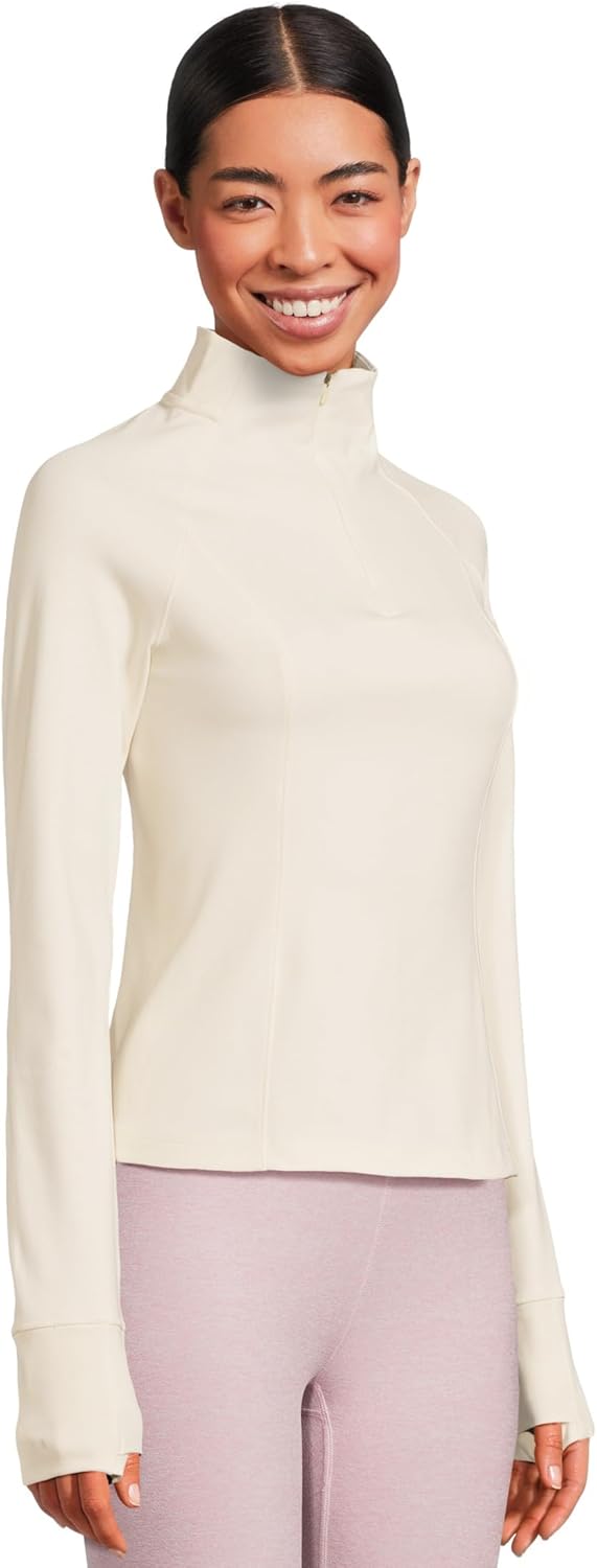 Keep moving in the cold in the Beyond Yoga Allure 1/4 Zip Pullover. The fitted pullover has zipper pockets to keep your essentials secure and a high collar and thumbholes for extra warmth for your hands. Every style we produce is wear-tested on our in-house team to ensure your best fit. Slim fit and pull-on style. High collar with quarter-zip placket and long sleeves. Contouring style lines. Straight hem. 77% recycled polyester, 23% elastane. Machine washable.