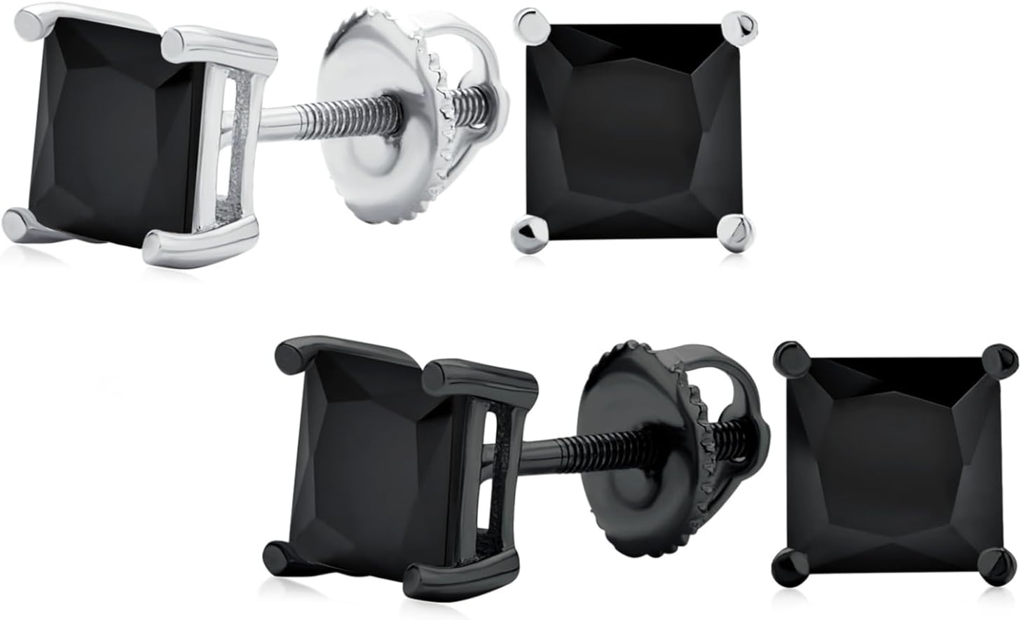 Black or Clear Brilliant Cut Square Princess Solitaire AAA CZ Stud Earrings For Men Women Secure Screw back Black Plated .925 Sterling Silver 5 6 7 8 9 MM