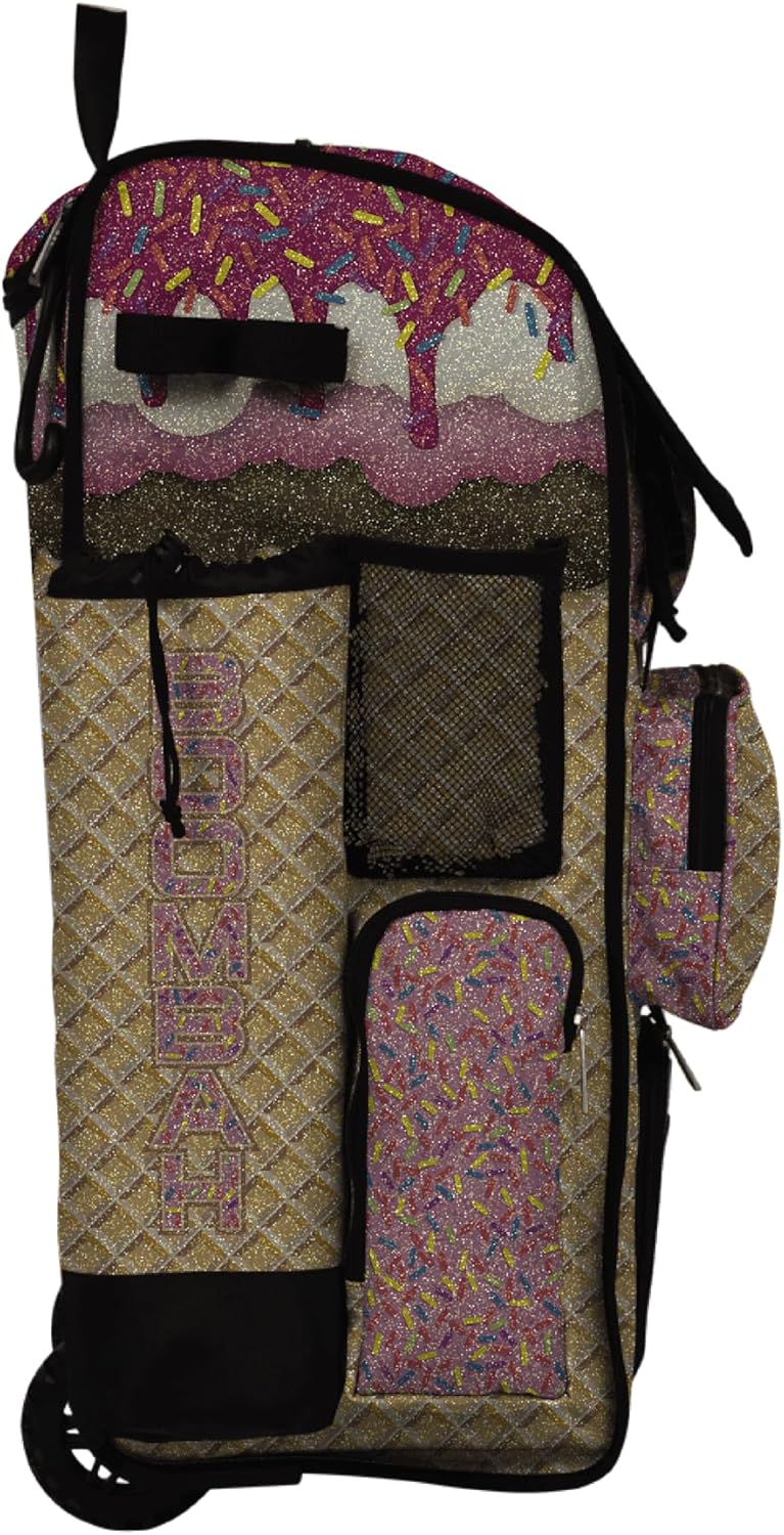 Boombah Rolling Superpack Glitter Baseball/Softball Bat Bag - 23-1/2" x 13-1/2" x 9-1/2" - Multiple Colors - Telescopic Handle and Holds 4 Bats The new and improved Superpack Rolling Bat Bag is an extremely durable and versatile bag for diamond sports with a focus on convenience and longevity. Key features include: - Built to Last: Engineered with the highest quality materials, our products are made to work as hard as you do - Glitter Fabric: Fabric shines rainbow when it catches the light, creating a bright sparkle all over. - Improved Base Chassis: New molded plastic base is significantly stronger and stiffer, preventing your bag from slumping when full. It also contributes to keeping the handle in place and maintaining its strength - Larger Heavy Duty Wheels: Now 40% larger than before - now nearly 4 inches wide. The new improved wheels lift the bottom of the bag over a half inch higher off the ground to prevent scraping on dirt and gravel - Reinforced J-Hooks: Easy to hang on the fence - Shoe Compartment: Keep items separate from the dirt and dust on your shoes by storing them in an individual compartment - Telescopic Handle with Additional Handle Position: Telescoping handle has an additional, shorter height option for younger players. The handle can now be adjusted to a position 4 inches shorter than the standard, fully-extended length - Wear-Resistance Fabric: Heavy duty fabric has been added to the bottom of the bag to further improve the lifespan of the bag. The material is specifically designed to resist scrapes/tearsAbout Boombah: Boombah baseball / softball products are part of our huge family of sporting gear, apparel and accessories. We design and manufacturer our own line of high quality sports equipment and gear for the sports you love.