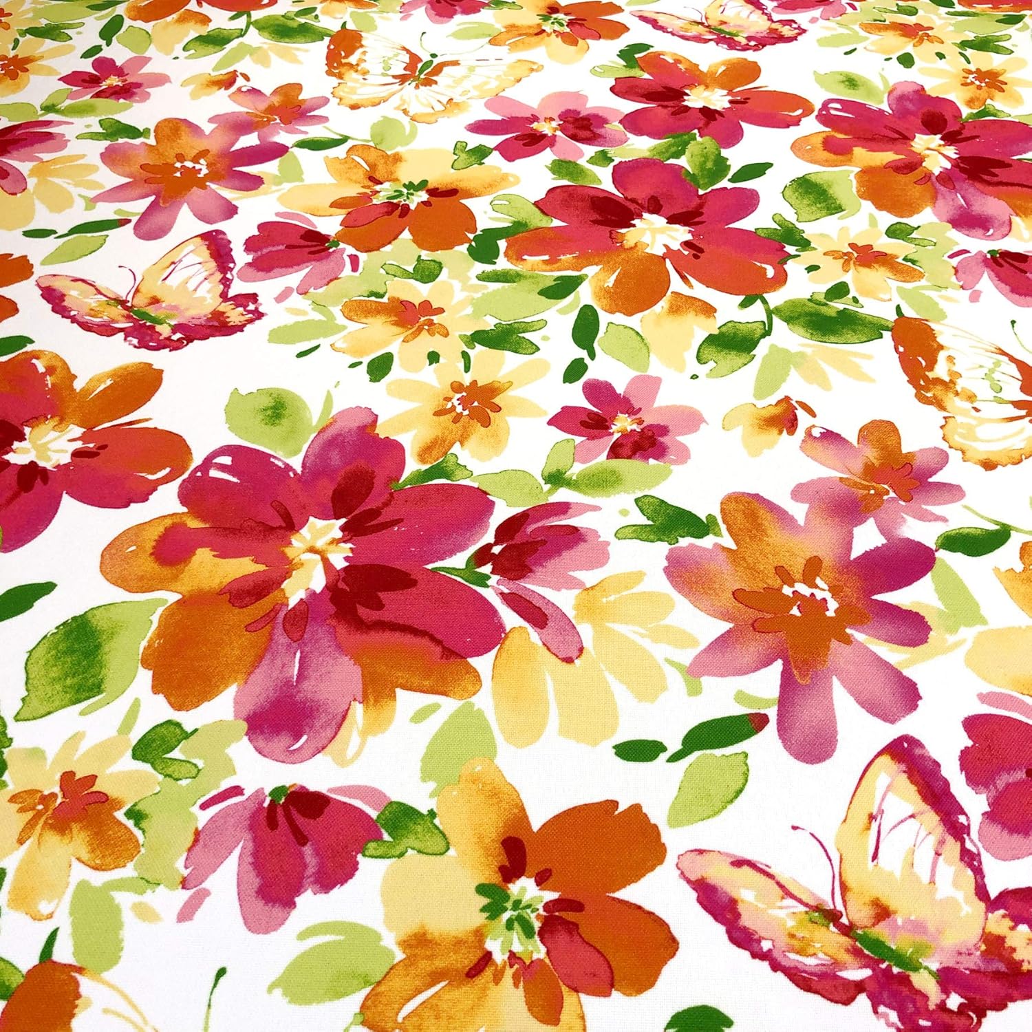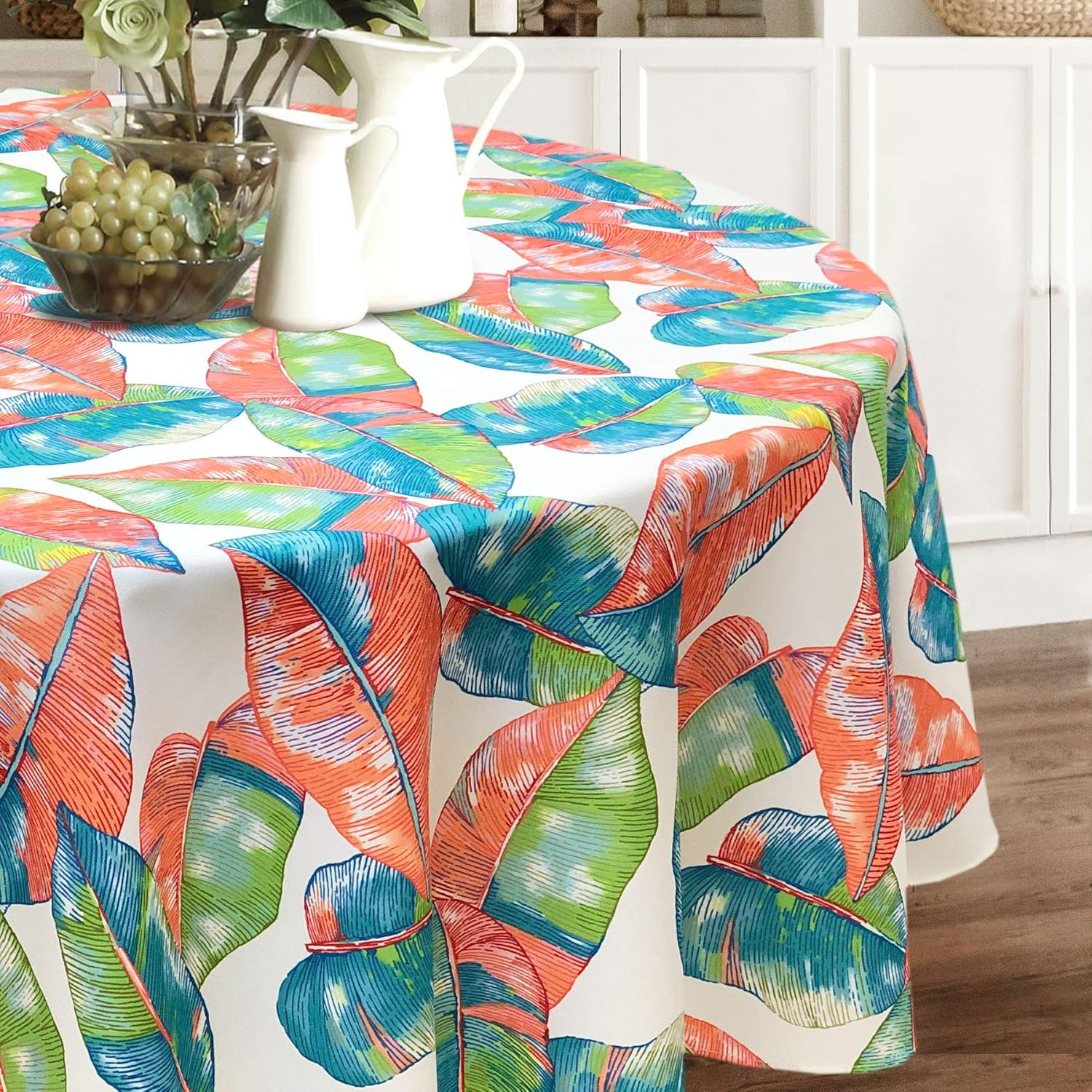 NEW! Here comes current and trendy color for spring summer! 100% Polyester. Stain resistant by water-repellent technology allowing spills to bead up. Perfect for indoor outdoor use. Easy care simply machine-wash cold and gentle cycle. Warm iron if needed. Two vivid natural designs are available: spring garden floral and summer palm leaf designs. Size: 60"x102" Rectangle. Provide protection to the table and decorate the house inside or outside!