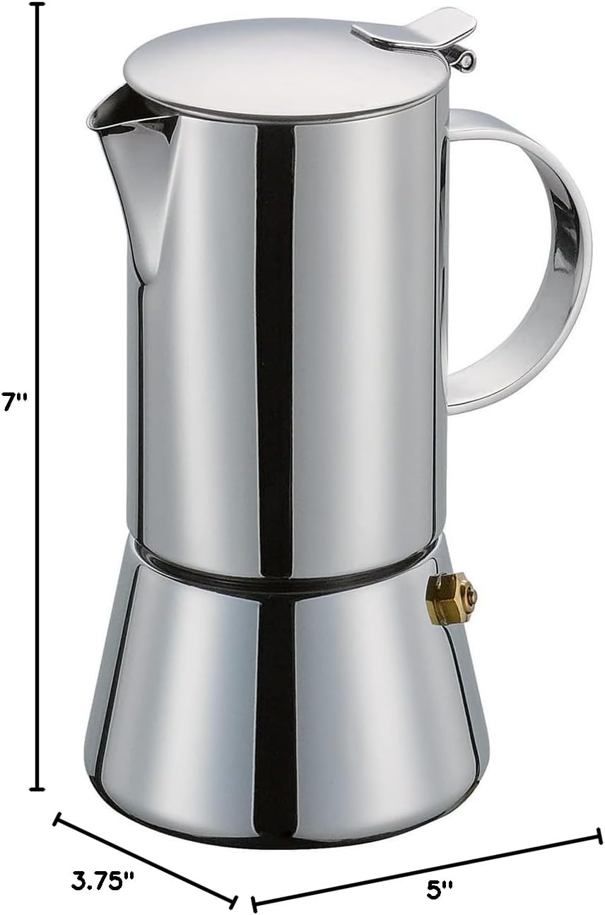 Product Description Stove top coffee maker from Cilio. Traditional design with a contemporary twist. Made from high quality polished stainless steel with a hygienic and easy to clean silicone gasket. Suitable for all hobs including induction. Capacity: 4 espresso cups. Measures approximately 17.5cm high, 9.5cm diameter at base. 5 year warranty against manufacturing defects. Not dishwasher safe. Boxed. Set Contains: 1 x Espresso Pot