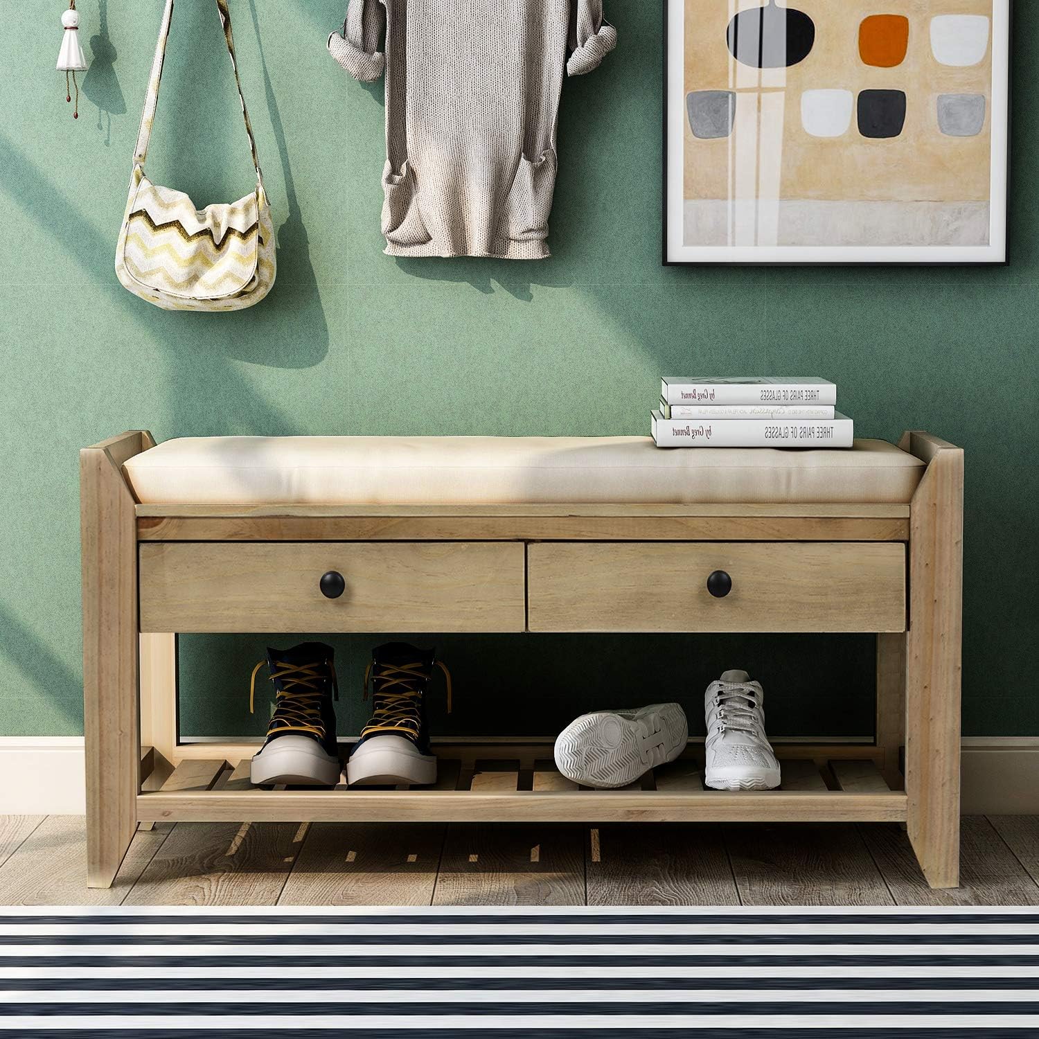 This storage bench is simple in style and the upholstered design is not only comfortable, which makes it look more elegant for entryways, utility rooms or walk-in closets, you will find it plays the role of a shoe, clothing, and daily necessities storage bench that can be placed in living rooms and checkrooms, the details of this simple nightstand are exquisite and the elegant simplicity can match perfectly with your home decor. Dimensions & Weight: Product Dimensions & Weight:42”L x 18”W x 29.5”H 41.8 LBS Package Dimensions & Weight:43”L x 21”W x 11”H 48.9 LBS Bench Interior Dimensions:19.2”L x 15.4”W x 11.4”H Top seat Dimensions:39”L x 17”W Weight Capacity Bench top: 250 LBS Shelf: 55 LBS Specifications: Product Name:Storage bench Material:Pine wood+plywood Thickness Cushion: 40 mm Leg: 40*40 mm Finish:Painting Finished Back:Yes Assembly Required:30 min Additional Tools Required:All tools included Pieces Included:One Package Number:1 Care & Maintance 1.Wipe with a soft dry cloth. Avoid the use of harsh chemicals and household cleaners as they may damage the finish. 2.Hardware may loosen over time; periodically check that all connections are tight. 3.Blot spills immediately with a clean, colorfast towel. Spot clean with a damp cloth or sponge, gently blotting to remove excess water, then air dry. For stains that can't be removed as such, professional cleaning is advised. We recommend periodically fluffing cushions and vacuuming crevices. To prevent fading, keep fabric out of direct sunlight. Notice: 1.Real Product’s Color may be a little different from the image due to the lighting or monitor’s display. 2.Manual measurement has been used, there may be some reasonable error.