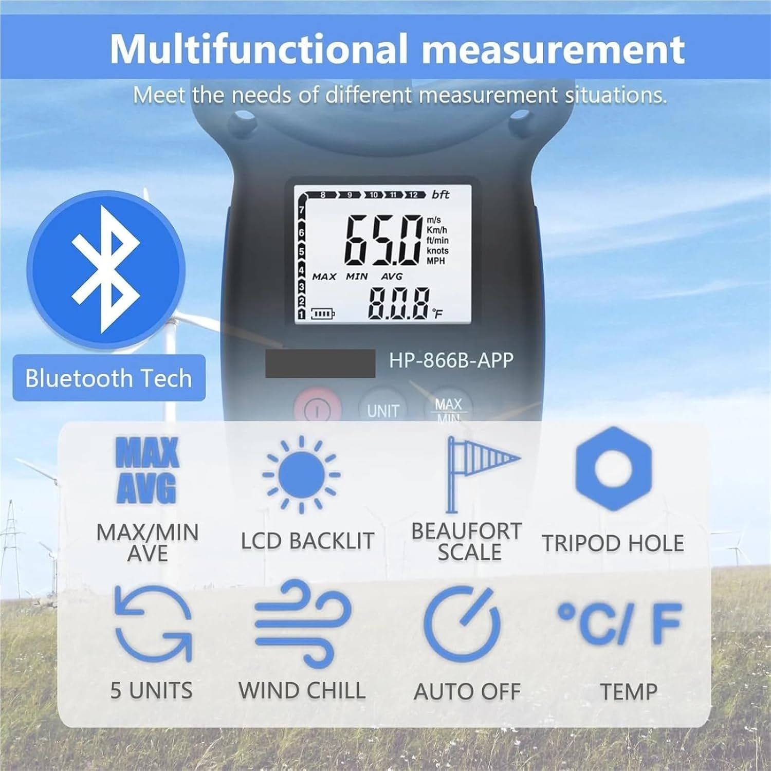 Wind Speed GaugesHP-866B-APP Digital Anemometer with for Wind Speed (0.3~30m/s), Temperature (/), Wind Chill, and BacklightFeatureWireless AnemometerThe wind meter can automatically pair with your iPhone, iPad, Android phone, and tablet via a app, allows you take wind velocity temperature readings remotely. Which means you can control the system settings while remotely compare the airflow output of different duct vent, and balancing the HVAC system accordingly.Handheld Wind Speed MeterAccurately measures air speed 0.3~67.1 mph (+/- 5% of readings) in 5 units: m/s, ft/min, Knots, Km/hr, Mph; Wind temperature -10~45(14-113); Wind Chill display. 2 temp sensors & 8 vanes makes this anemometer sensitive to pickup low airflow and get accurate wind temp measurement quicklyRemotely Airflow BalancingThis digital wind gauge features a 1/4 metal hole at the bottom for tripod Mountable , continuous wind measurement logging, export it to Excel or txt files for analysis. making it an ideal wind velocity gauge for weather stations, sailing, and long-distance shooting. APP can easily download on Play / App Store, named "intelligent anemometer".Multifunctional Wind Meter GaugeMax/Min/Average wind speed measuring mode helps you know about the wind peak, average wind speed output. Beaufort wind scale : 0 ~ 12 to let you keep track of current wind speed level for sailing. Equipped with Auto Power OFF, Manual/Auto Back Light functions, Data Hold, Data Logger, and automatic backlight dimming, this device ensures you save battery life.12 Months WarrantyIt's a palm size portable wind speed meter gauge for outdoor indoor wind measurement, such as: boat sailing, sky surfing, long distance shooting, flight, duct, vent, etc. For any quality problem, we' ll replace or refund you.SpecificationBattery :AAA 1.5V×2Thermometer: NTC thermometerOperating Temperature :-10~45(14~113)Relative Humidity: 90%RHStorage Temperature :-40 ~60 (-40 ~140Storage temperature -40 ~60 (-40 ~140)Current consumption: Approx. 3mAWeight :153g (including battery)Wind Speed Range: 0.67~67.1 mph (0.3~30m/s)Wind Speed Range Accuracy: ±5% of readingWind Temp Range: 14-113 (-10~45)Wind Temp Accuracy: ±2 of readingResolution: 0.1m/s; 0.25 Velocity Units Optional: m/s, Ft/min, Knots, Km/hr, MphCFM = Air Velocity (Ft/min) x Cross-sectional Area (Ft²)What You Get?1 * Hand Strap1 * Protective Case1 * User Operating Manual1 * HP-866B-APP Digital AnemometerHow to install the APPThis anemometer is offered in 2 systems: Mobile system( Android/IOS) installation.1.Scan the 2D code image at the top.2.According to the cell phone install the cell phone application prompts.3.After installation, the anemometer needs to be opened before use, and the turn on the cell phone transmission function.4.When the green light is so on, it means the match is successful. Click the cell phone interface. Start button on the cell phone interface, the anemometer and the cell phone can be transmitted in both transmit.5.When the shutdown time is set to 0, the anemometer will not shutdown automatically. When the auto setting is turned off, the anemometer will automatically stay sleep state. In this case, it can be woken up by the button on the button,6.The power interface is located on the right side of the anemometer, which can be connected to the power adapter blow 12V.Wind Speed Gauge Meter, Digital Anemometer Handheld Portable, Temperature Air Velocity Wind Chill Backlight Measuring Device for Shooting Flying Golf, HP-866BHighly Accurate Wind Meter: Thanks to the sensitive dual temp sensors, 8 vanes, smooth fan shaft, the HoldPeak 866B Anemometer can accurately detect wind speed, wind chill and temp. And this digital anemometer has a wind speed measurement range of 0 - 30m/s, Which can help you monitor wind conditions in real time.Professional & Multifunctional This Pro wind speed meter has functions such as unit switching of wind speedms, km/h, ft/min, knots, mph) and wind temp(,), Max/Min/Average Wind Speed, battery level display, auto off, backlight, etc. Which can meet various measuring demands.With Tripod Hole & Hand Strap Our handheld anemometer has a tripod hole that allows you to relax your hands while measuring It also comes with a hand strap which prevents it from being dropped or lost This ensures every shooting, sailing, or flying safer and more enjoyable.Lightweight with Carrying Bag: This lightweight and user-friendly anemometer is perfect for outdoor enthusiasts. And it comes with a waterproof carrying pouch that allows you to carry and protect the device better during outdoor activitiesWide Applications: This handheld wind meter is ideal for outdoor activities like surfing, flying, kite flying, boating, golf, etc. And it is sensitive to measure very low air flow in HVAC installation, duct vent.FEATURES & SPECIFICATIONSWind Speed Range 0330m/s (MAX up to 69mph)Accuracy of Wind Speed: 0.1dgtsResolution: 0.1m/sBack Light : Wind Chill Indication : Low Battery Indication : Manual/Auto Power Off : Wind Speed Unit Selection: m/s Ft/min Knots Km/hr MphMAX/MIN/Average/Current : /: NO USB PORT==========Battery Included : NoHigh-concerned chemical : NoneType : AnemometerModel Number : HP-866B-APPCertification : Wind Speed Range : 0.3-30m/sTemperature Range : -10-45°CBack Light : YESMax/Average/Current : YESWind Chill Indication : YESConnect to Phone : YESReal Time Measure : YESSize : 165X85X385mmWeight : 200g