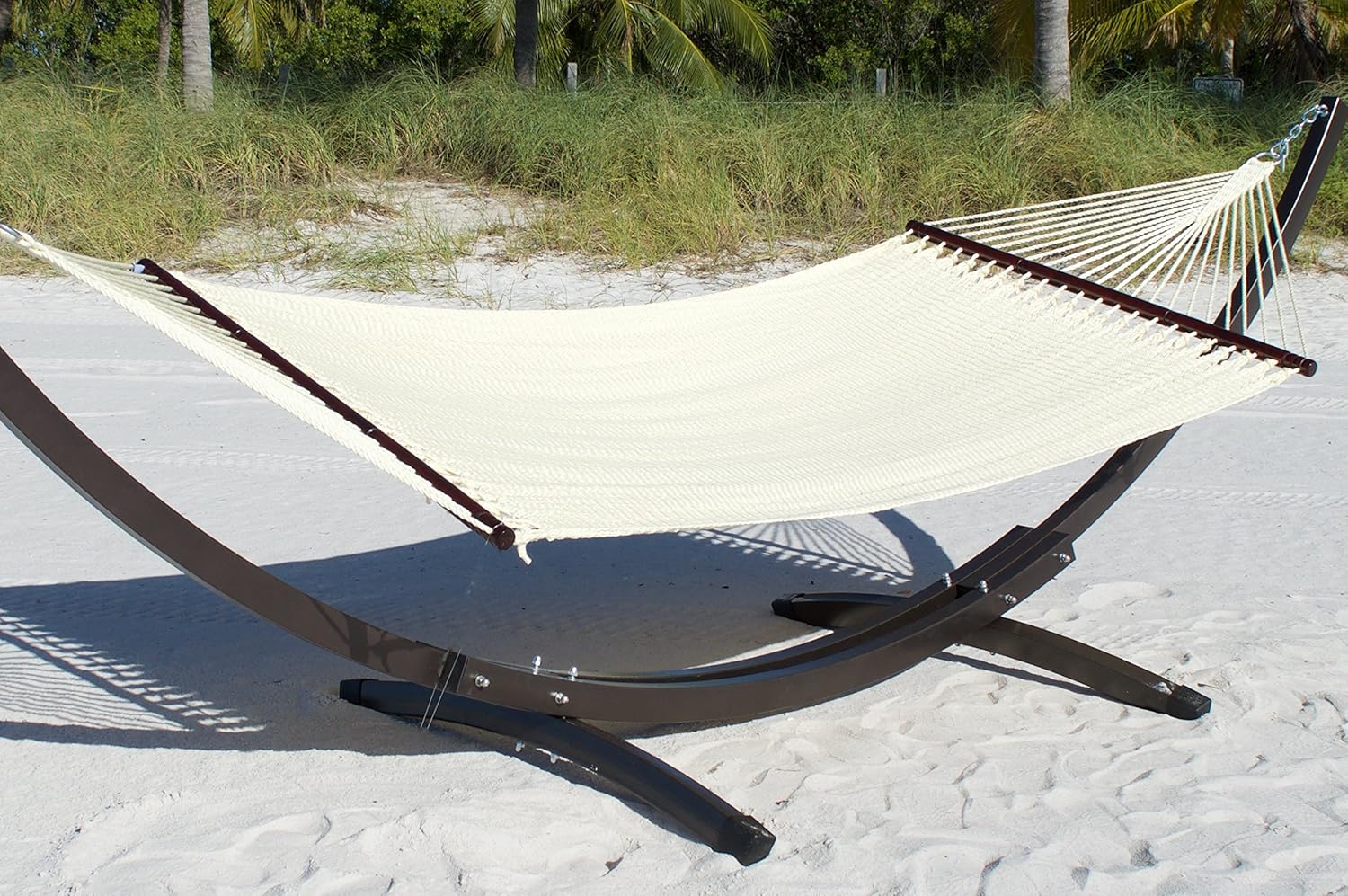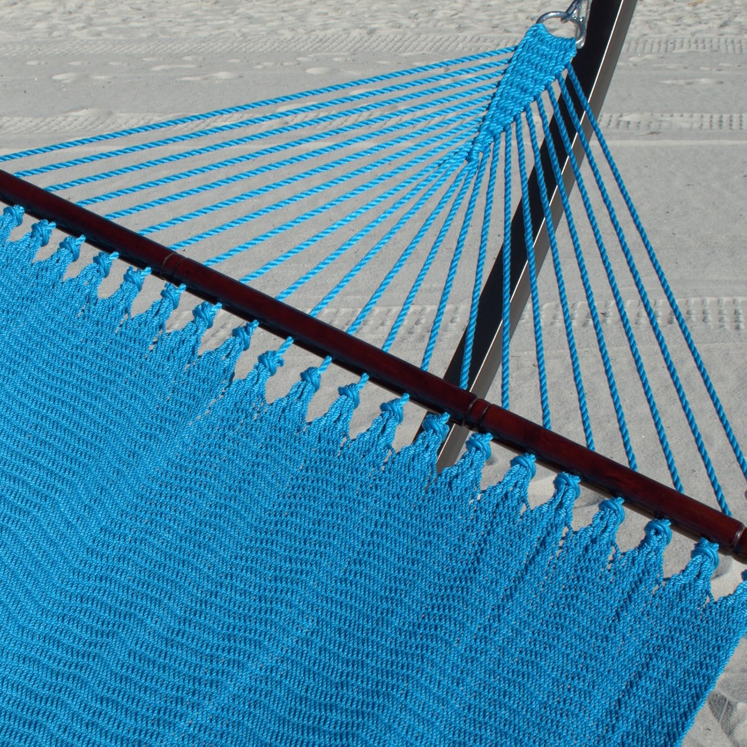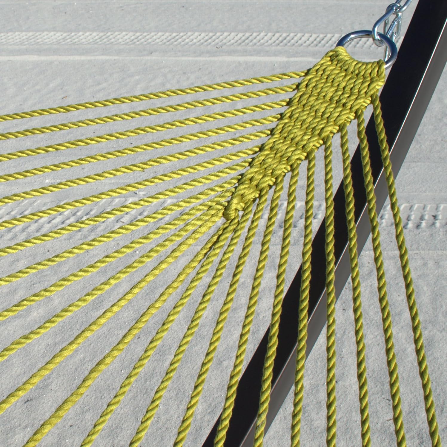 The Caribbean Hammock brand combines the best quality raw materials with artisan hand weaving techniques to produce the most comfortable, premium quality hammocks. This hammock is a double and can hold two MEDIUM size people in comfort and style. It is hand woven from soft-spun polyester cords in an extra tight micro-weave to provide the ultimate in support, comfort and relaxation. Top quality weather durable materials are used to keep this hammock in tip top shape for many seasons outdoors. Our polyester cord is soft to the touch and comfortable on the skin. The hardwood spreader bars are 48 inches wide with multiple coats of glossy marine varnish to keep it looking great while protecting the wood from the elements. Suspension O rings are 305 stainless steel and the largest in the industry for your safety and security. If your looking for the most comfortable, luxurious style of hammock you have found it here ! STAND NOT INCLUDED * hanging height is 4 feet or more. * hanging distance 11.5 feet or more. * weight capacity is 400 lb. * factory dyed garment grade polyester cords. * 305 stainless steel O rings. * Stand not included. Important note :- We believe in a fair and balanced supply chain. All our suppliers and their facilities have been personally inspected by me. Our products are sourced from clean, safe, responsibly managed sources. Our workers are fairly compensated for their time and effort. We believe that our focus on better working conditions shows in the quality of our products. 1 Year Limited Warranty - we strive for the best quality products and stand behind them 100%, if you should have any problems with your hammock please don't hesitate to contact us.