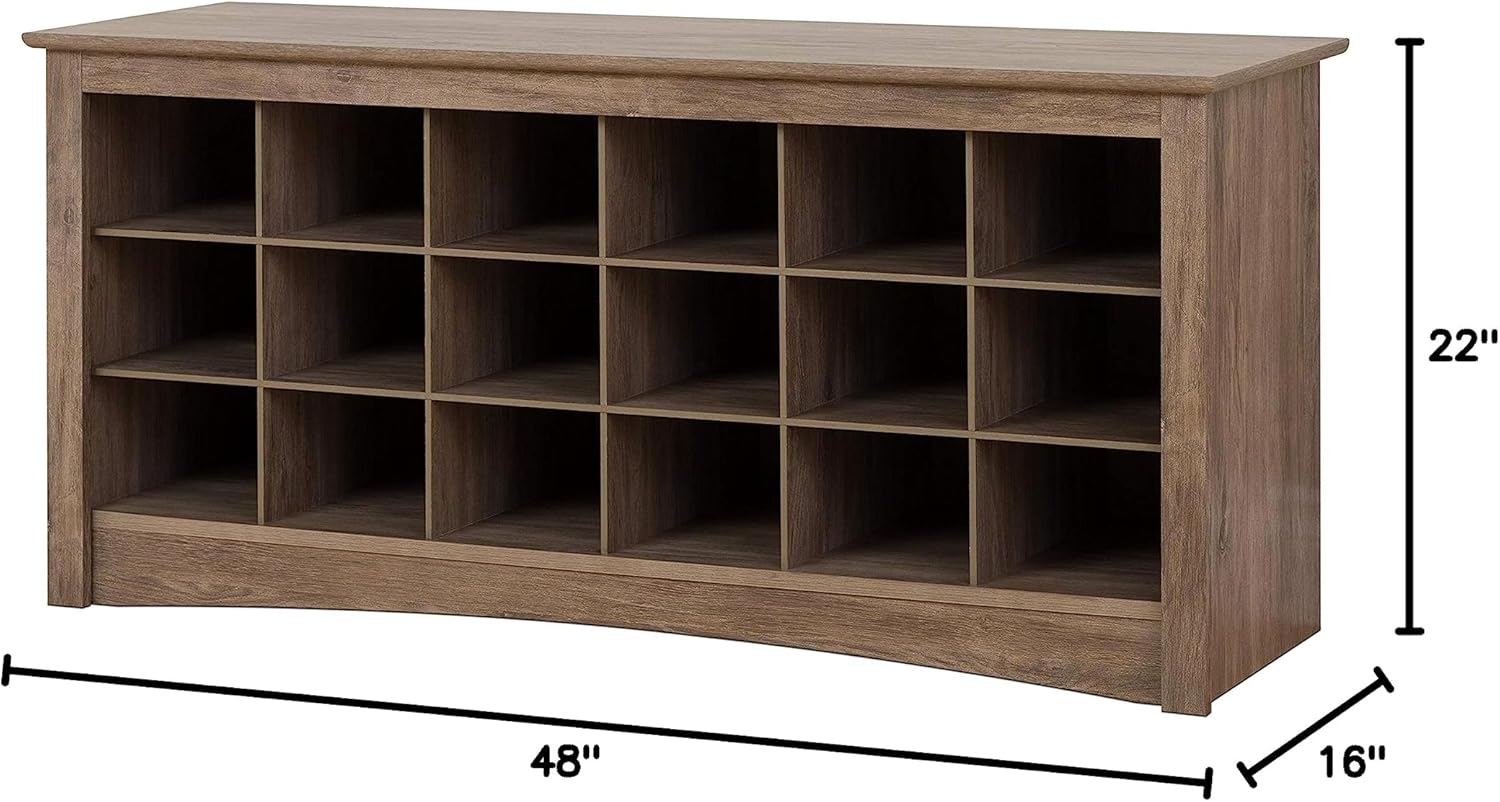 Frame Material Info: MDF, WoodPrint : SolidColor : Grey StorageGrey finishMaterial Info: MDFPattern : SolidMDF constructionAssembly : Assembly RequiredBench type : Entryway, Shoe Rack Bench, Storage Benches48 inches wide x 22 inches high x 16 inches deep Design/Look: FarmhouseProduct Size: 48 inches wide x 22 inches high x 16 inches deepStorage type : Shoe StorageTop Material Info: Wood