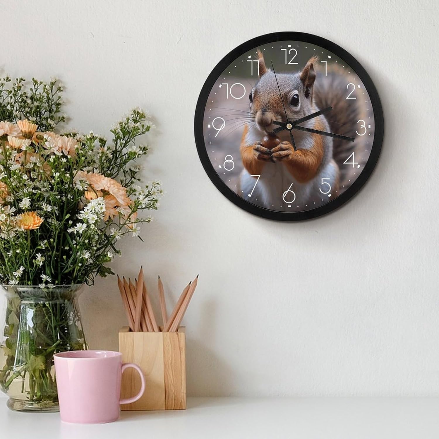 Uses one "AA" battery, the product does not include batteriesThe Cute Squirrel print 10-inch round wall clock is clearly visible from a distance. Kitchen wall clock, battery wall clock, perfect silent wall clock completely meet all your decoration needs. The silent wall clock does not emit any annoying ticks, allowing you to enjoy a quiet and comfortable environment in which to sleep and work.
