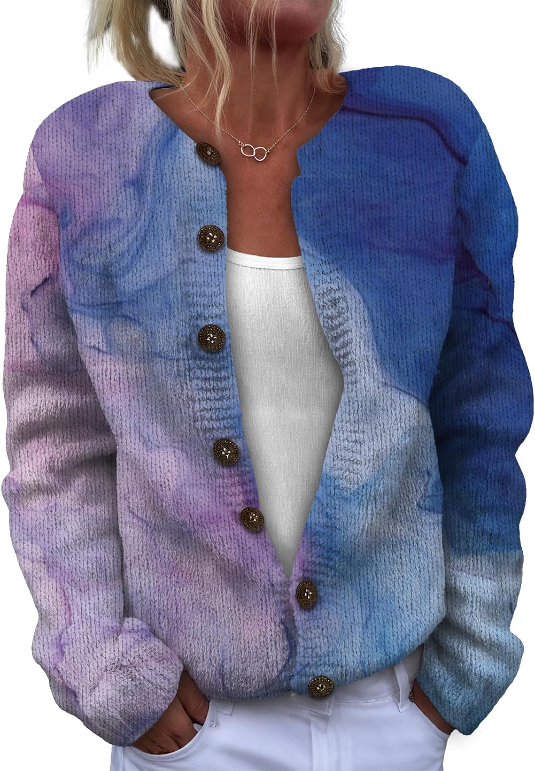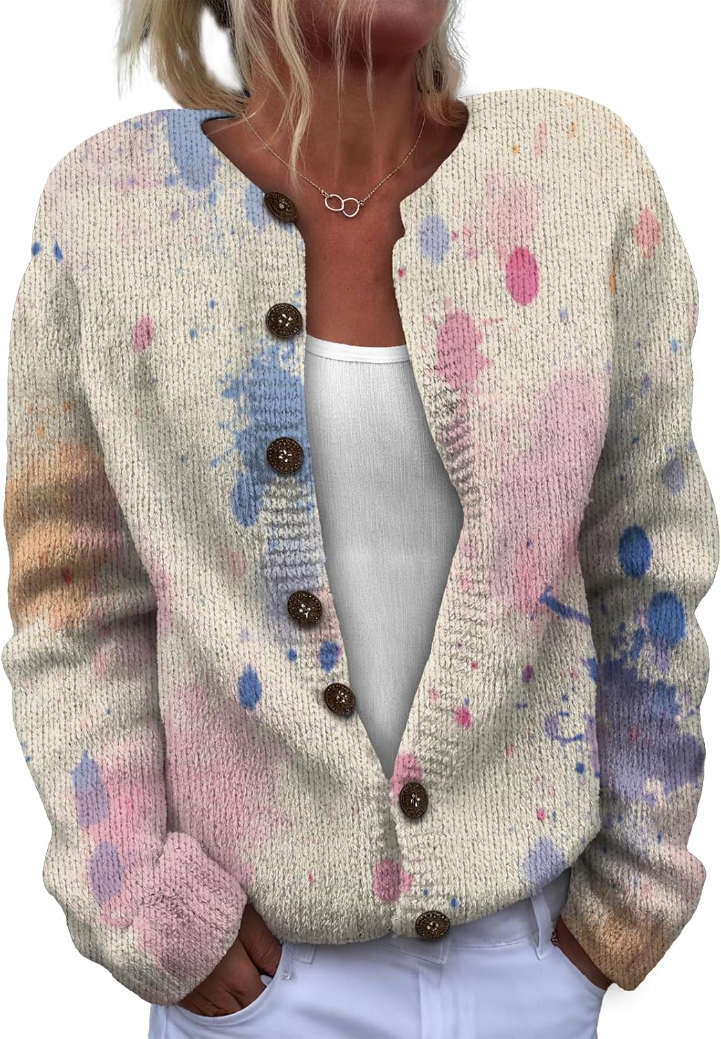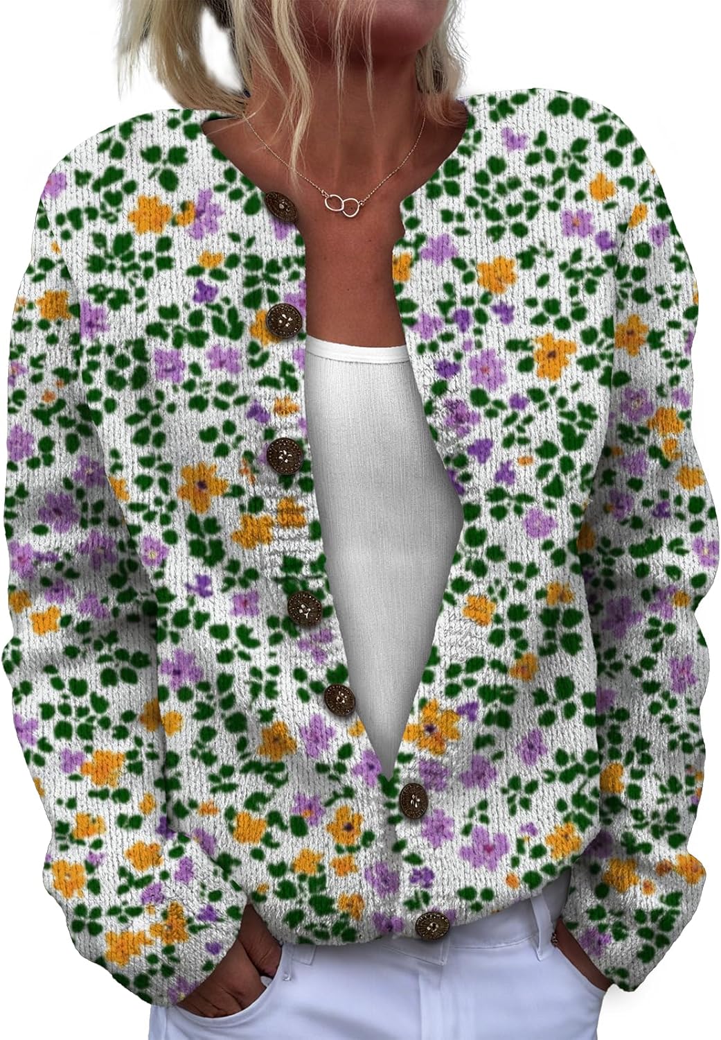 This women's long-sleeve knit top is made of soft, lightweight and comfortable fabric. It won't irritate the skin when worn alone, and it can be machine-washed without easily losing its shape. With a basic, simple and regular fit, it flatters the figure and allows for unrestricted styling. The classic button and round-neck design ensures timeless appeal, being both durable and fashionable. It can be worn as a pullover or unbuttoned as a cardigan. Paired with a necklace, it looks stylish and exquisite. It's a must-have item in the autumn wardrobe.