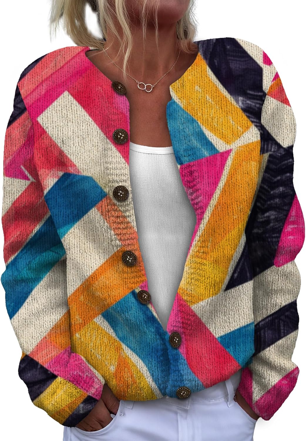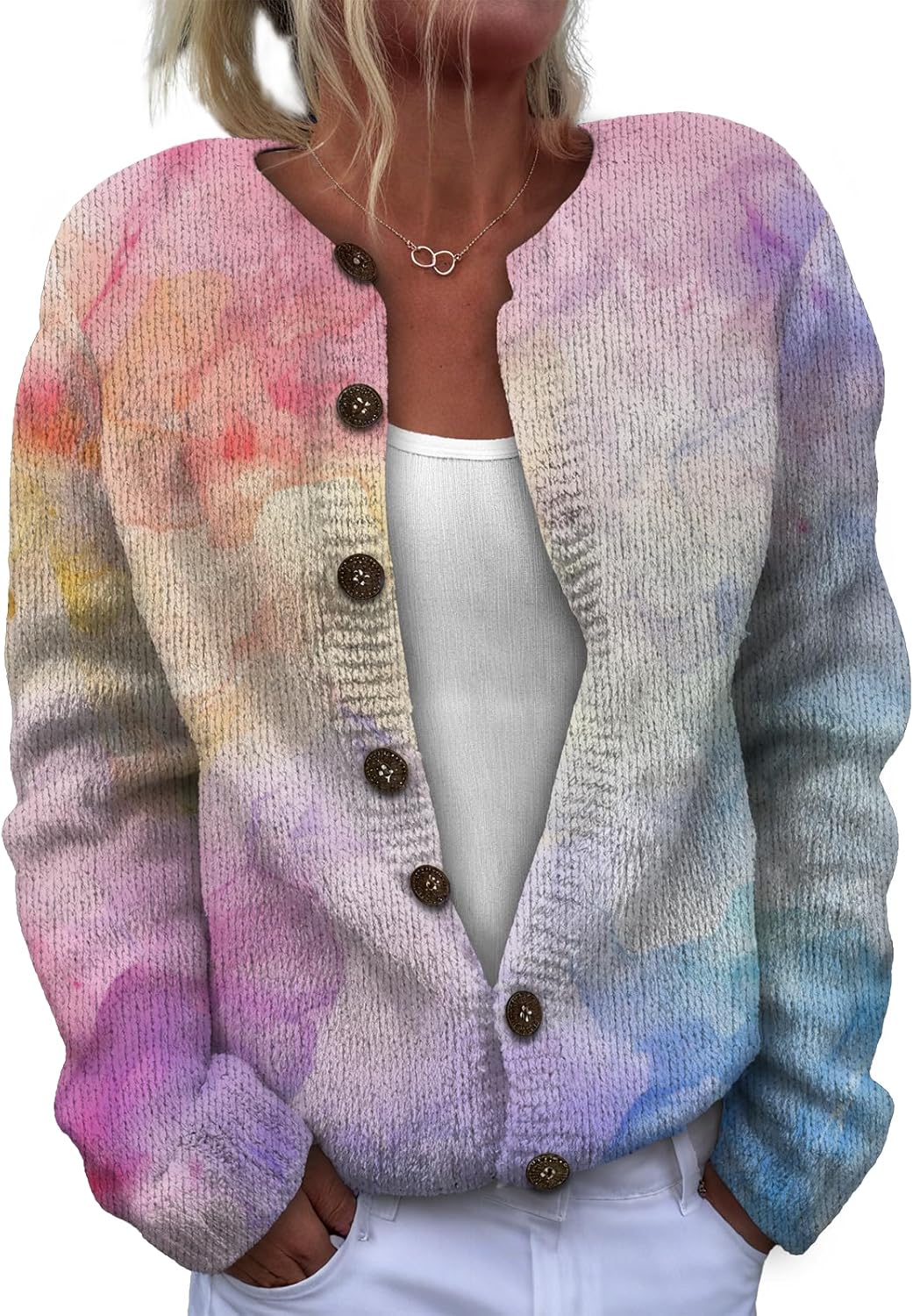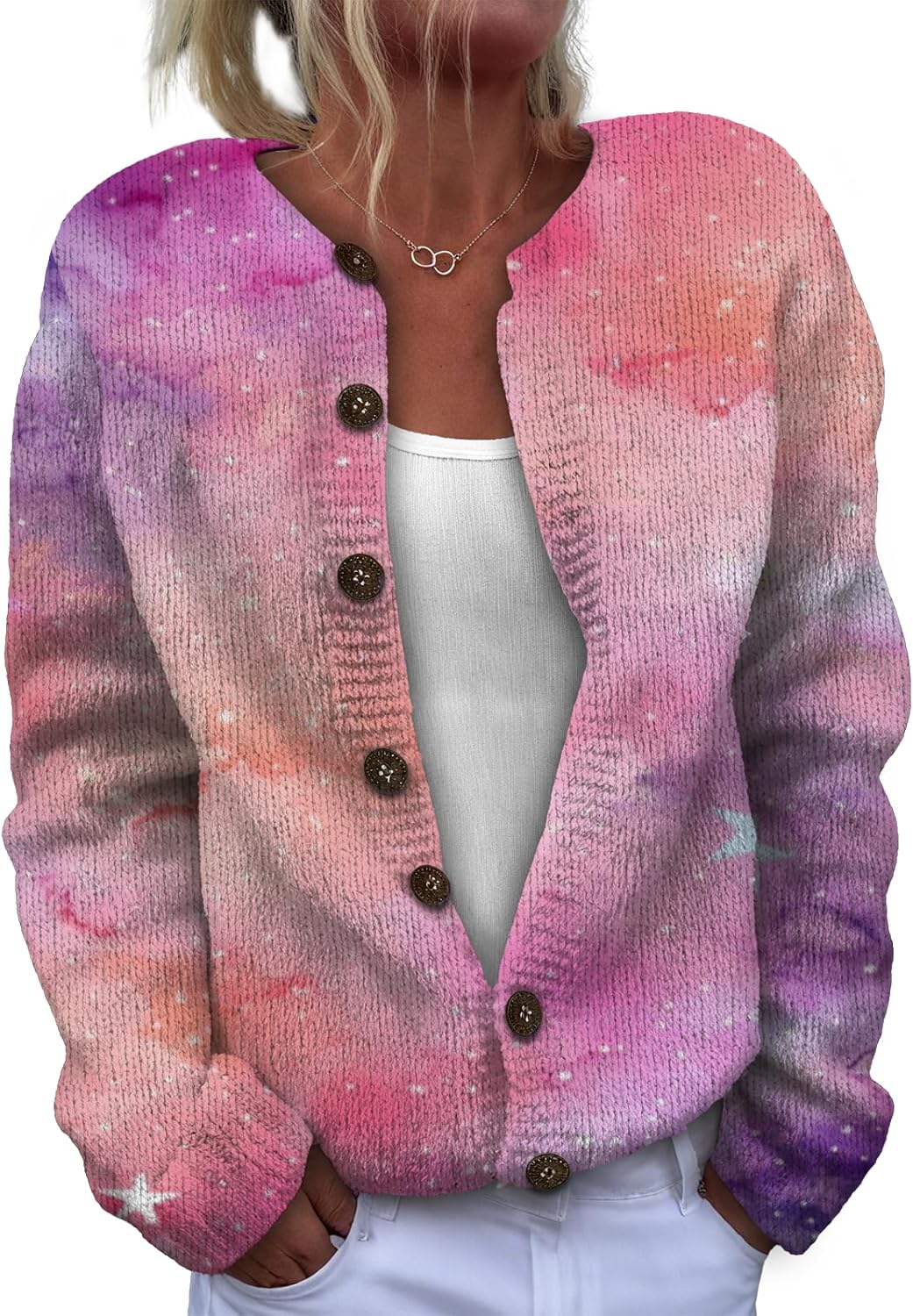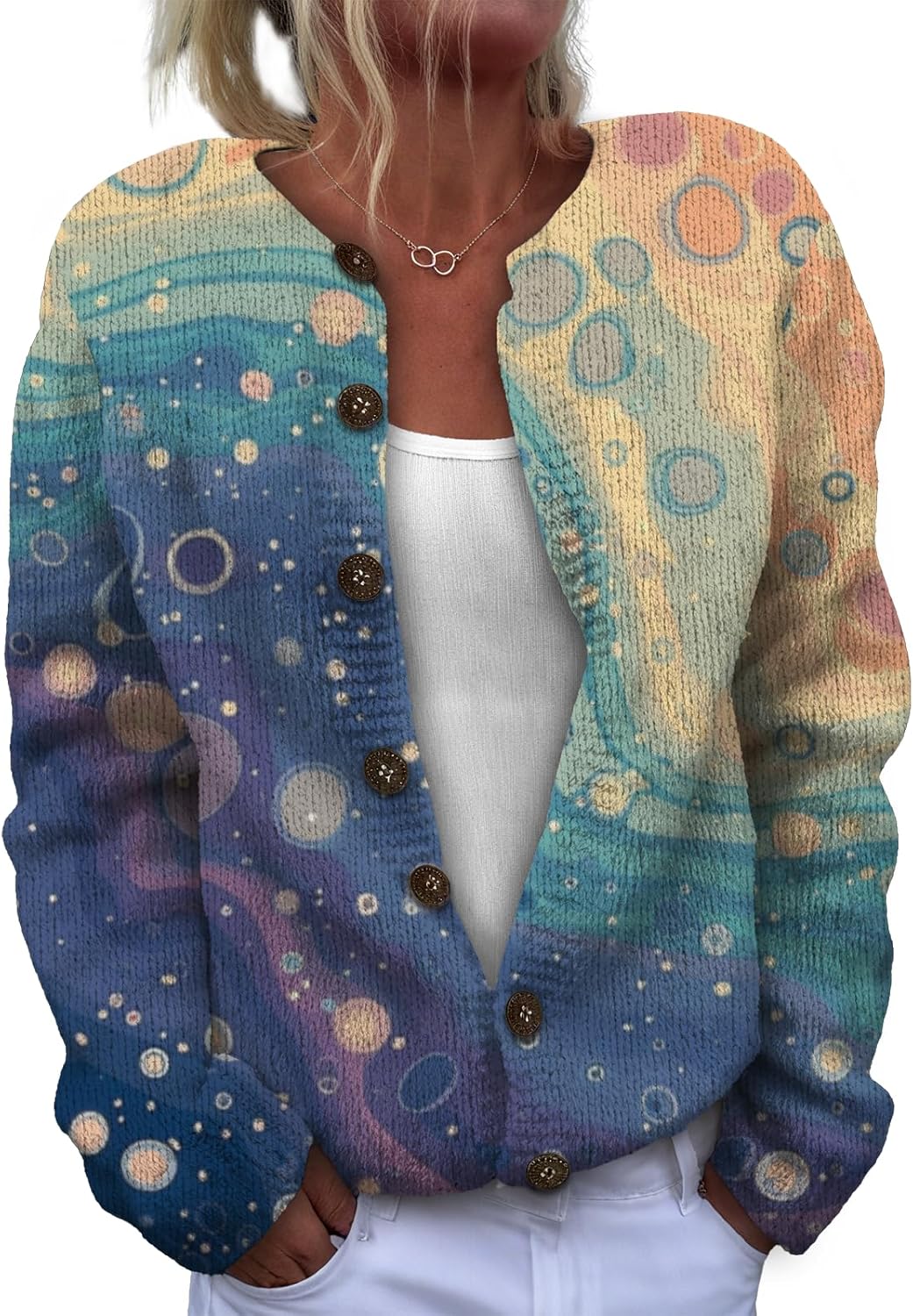 This women's long-sleeve knit top is made of soft, lightweight and comfortable fabric. It won't irritate the skin when worn alone, and it can be machine-washed without easily losing its shape. With a basic, simple and regular fit, it flatters the figure and allows for unrestricted styling. The classic button and round-neck design ensures timeless appeal, being both durable and fashionable. It can be worn as a pullover or unbuttoned as a cardigan. Paired with a necklace, it looks stylish and exquisite. It's a must-have item in the autumn wardrobe.