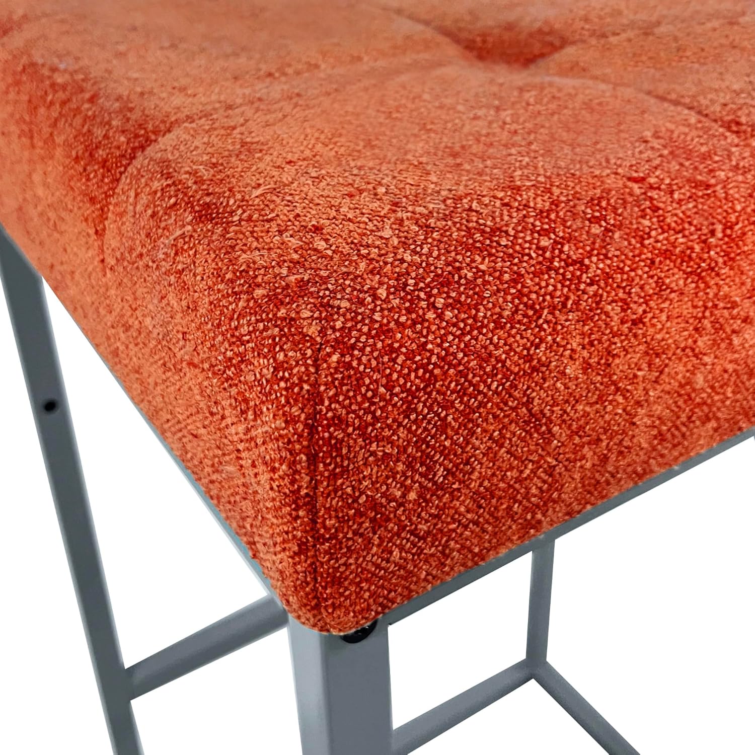 The GIA 30-inch bar height square backless metal stool featuring a modern design and vibrant orange chenille cushion. The tufted seat not only provides a stylish appearance but also offers exceptional comfort for long periods of sitting. Its sturdy gray metal frame complements the soft cushion, creating a perfect balance of durability and aesthetics. With its ergonomic 30-inch height, this bar stool is the ideal addition to your kitchen island, home bar, or café. The compact, square design saves space while adding a pop of color to your décor. Floor-friendly foot caps ensure that your floors remain scratch-free, making it a practical choice for any environment. Each stool is 30inches tall, 17.32 inches in length, and 14.96 inches in width and are designed to be used indoors.