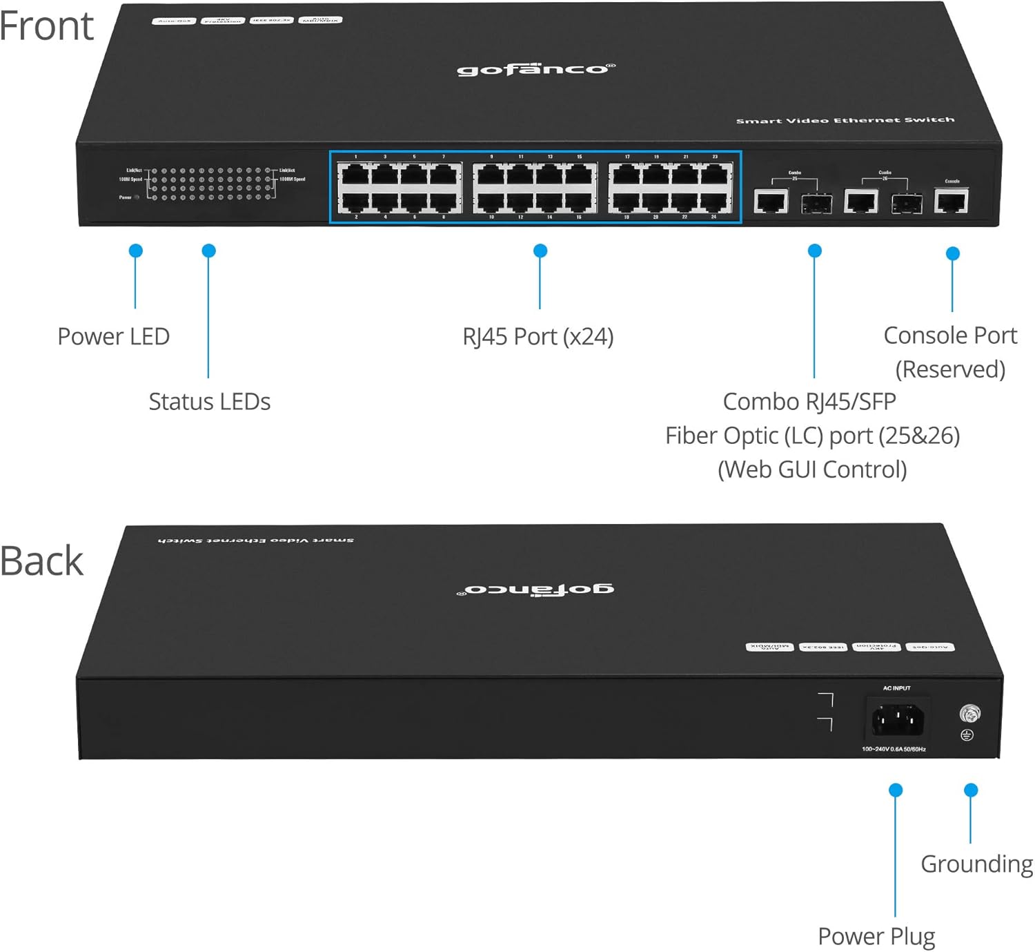 | BuiltIn Media | 24-Port Smart Video Ethernet Switch, Power adapter, RJ45 to RS232 Console Cable, Rubber pads, Surface mounting accessories, User’s guide |