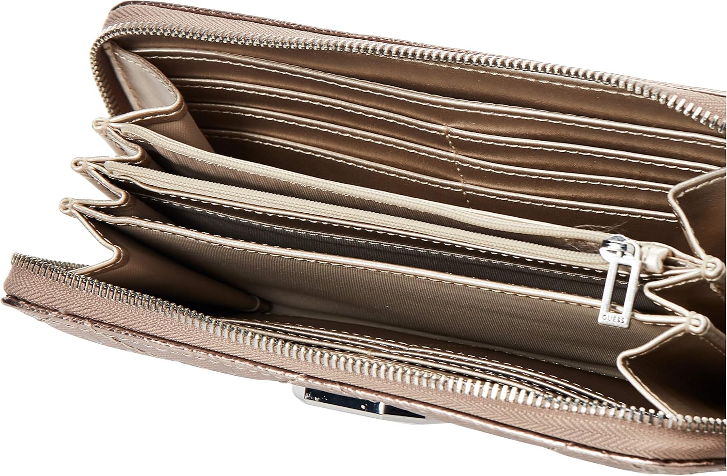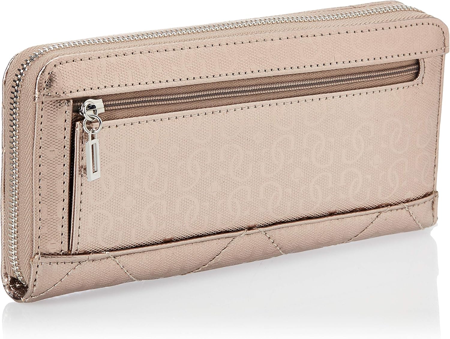 Zip-Around Closure silver tone hardware Removable wristlet strap with 8" drop Divided interior features 2 bill slip pockets, 12 card slots, 1 zipper pocket Exterior back zipper pocket Dimensions: 8"W x 4"H x 1"D