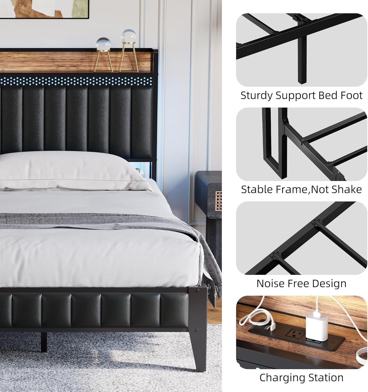 IDEALHOUSE Full Bed Frame with Charging Station, LED Bed Frame with Storage Headboard, Upholstered Platform Bed Frame, No Box Spring Needed, Easy Assembly, Black