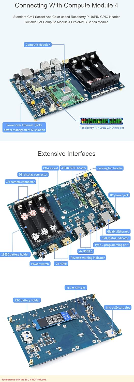 Overview PoE UPS Uninterruptible Power Supply Base Board/Mini-Computer designed for Raspberry Pi Compute Module 4, Gigabit Ethernet, Dual HDMI, Quad USB2.0 Package Contains CM4-POE-UPS-BASE x1 Aluminum alloy case (top and bottom) x1 Fan x1 12V 2A Power Supply x1 Screwdriver x1 For more details you may need to know, pls firstly send me message via , I will then send attached document including User Guide for you, thank you for patience.;D