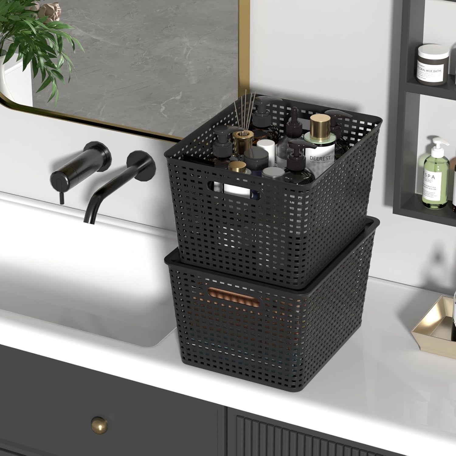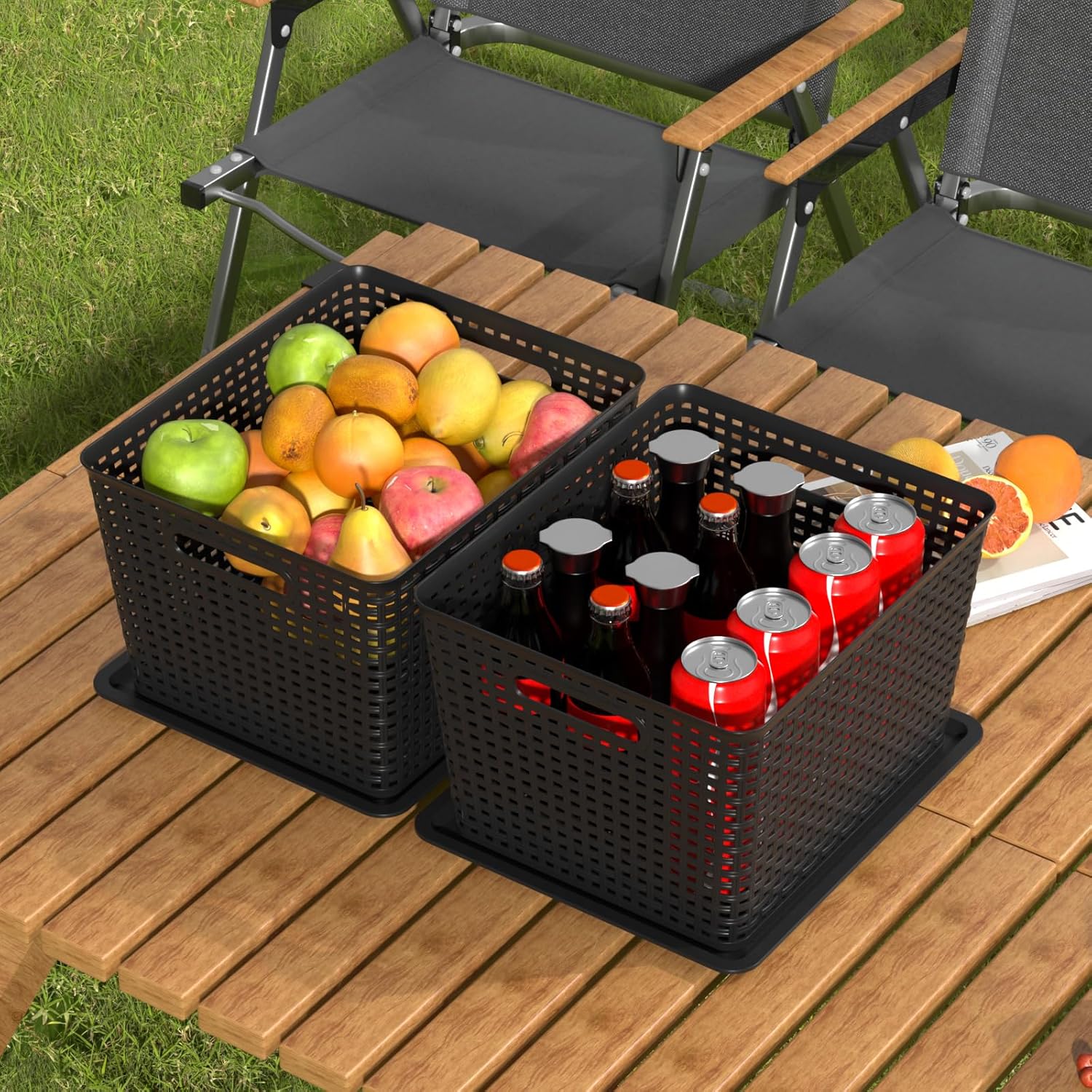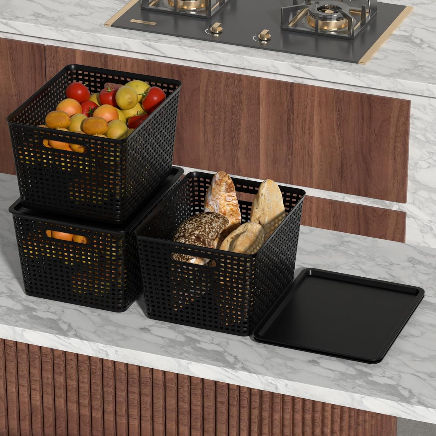 Innouse 6 pack black plastic storage baskets with lids, nestable and stackable, saving space, large size: 14" x 11.6" x 8.7". Multi purpose, can organize many items such as vegetables, fruits, snacks, beverages, seasonings, toiletries, books, building blocks, etc.