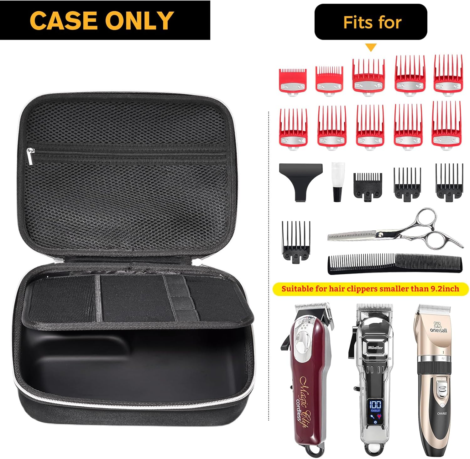 This pack contains a barber case with washable oliproof inner casing along with another hard barber case with small pouch for holding guards. Two styles to meet your different storage needs.