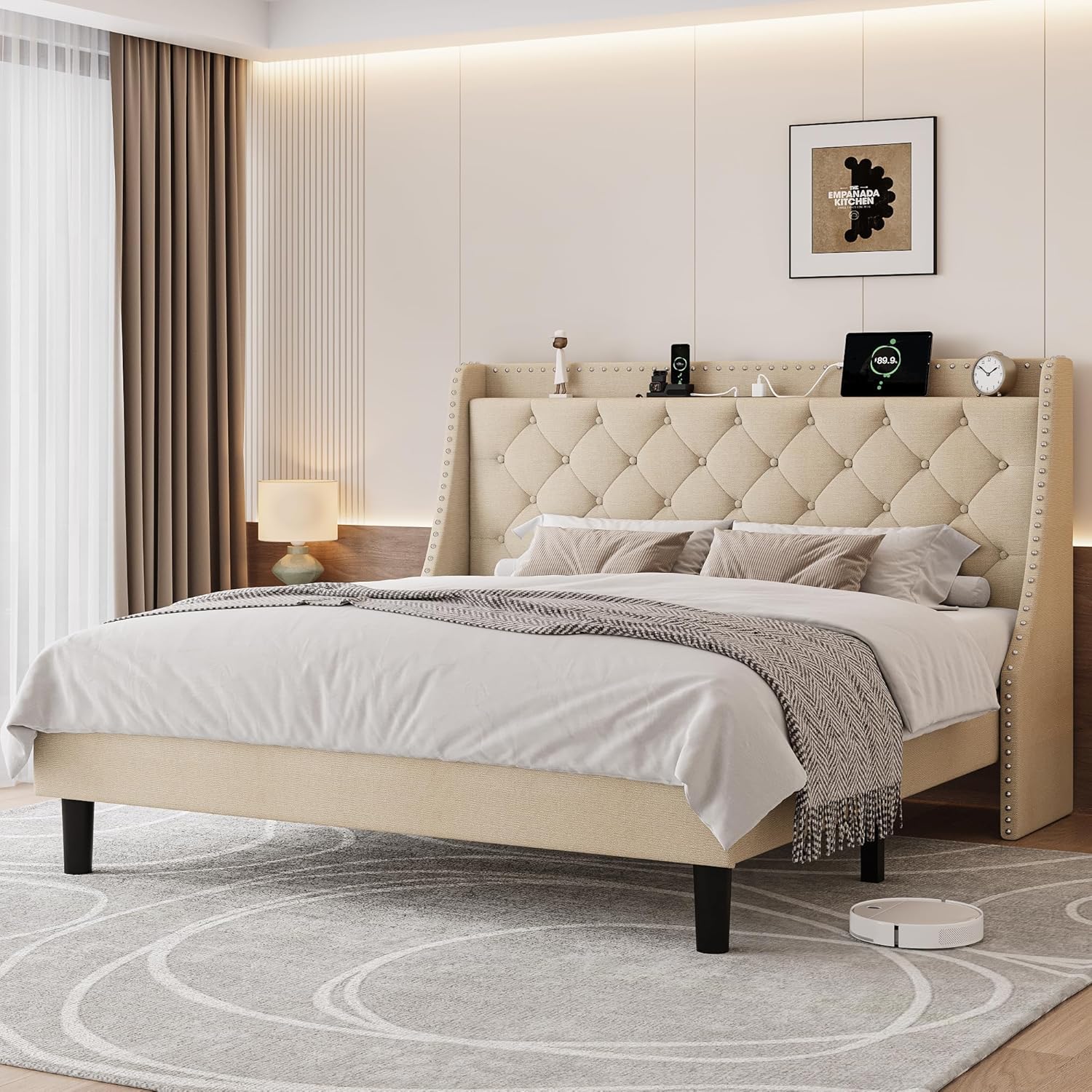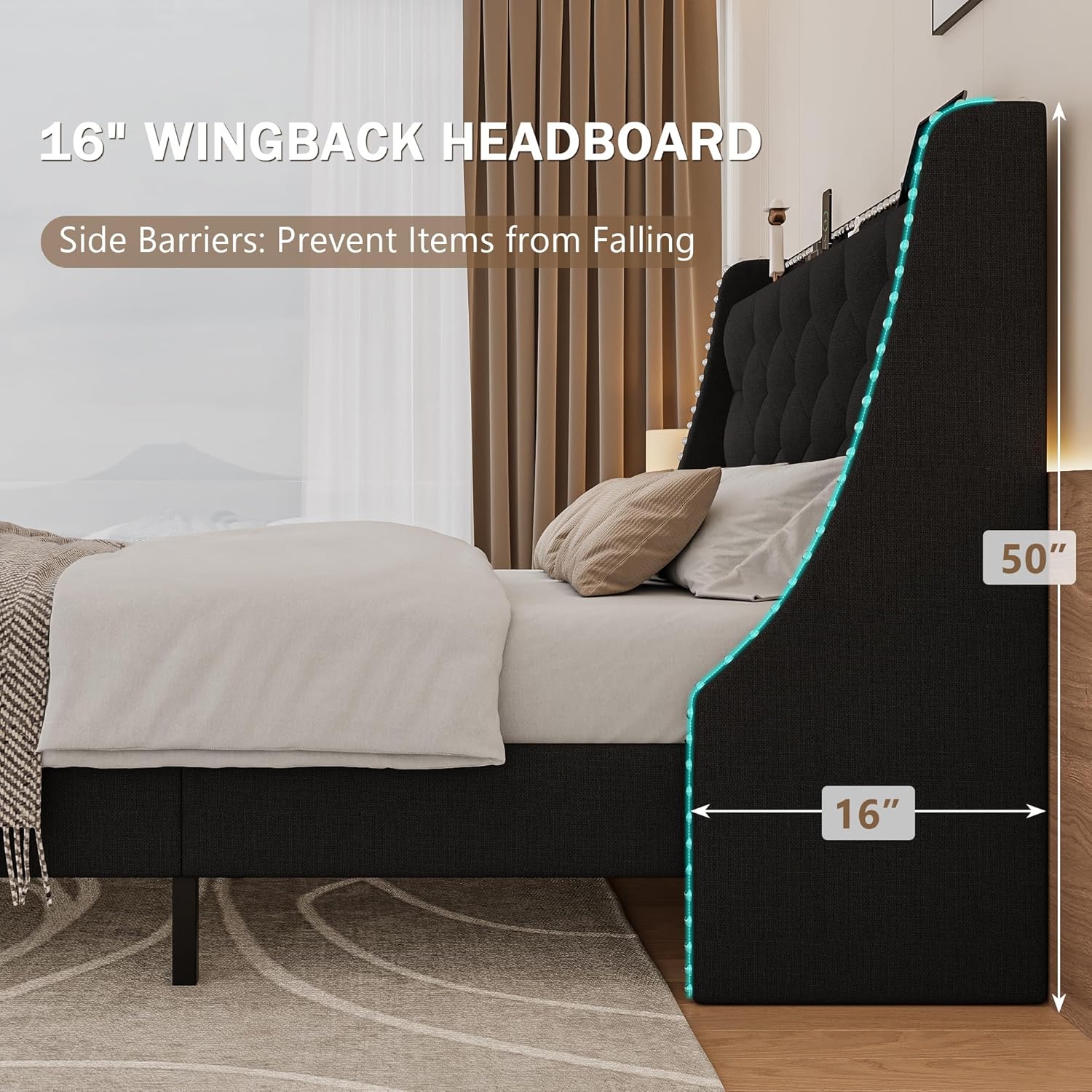 | Other Special Features of the Product | 16" Wingback Button Tufted Storage Headboard, 8" Under-Bed Space, Charging Station, Squeak Resistant, Sturdy Wood Slats |