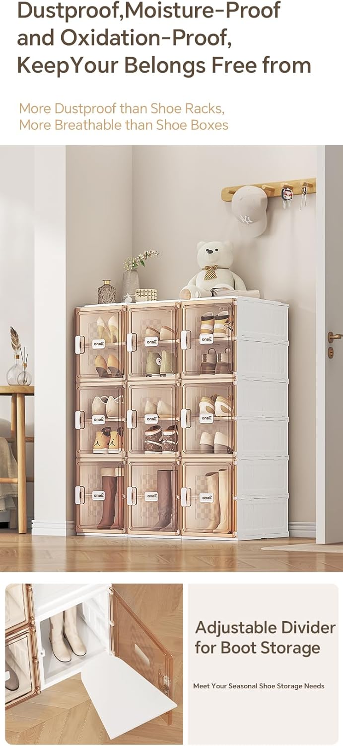 Featuring an innovative mortise and tenon construction for quick assembly without screws, this folding shoe box is designed for easy portability and storage. With a spacious grid and adjustable dividers, it can easily accommodate a wide range of shoe sizes, and the transparent see-through lid allows you to find your shoes at a glance. In addition, it is also beautiful and practical, suitable for home, dormitory and other occasions, make your life more neat and organized.