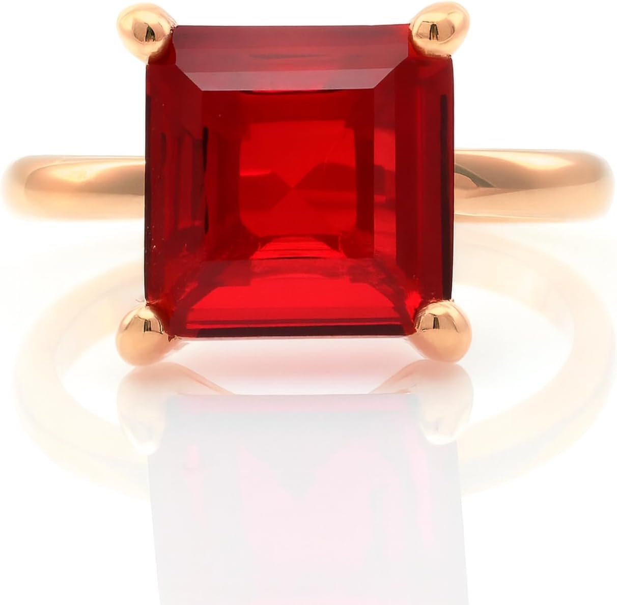 A sumptuous square Ruby takes center stage in this rose gold solitaire ring. Finished with a gleaming, single band, this Ruby birthstone is an adorable, everyday, wear-anywhere piece. Also a memorable gift ring for a lovely lady.