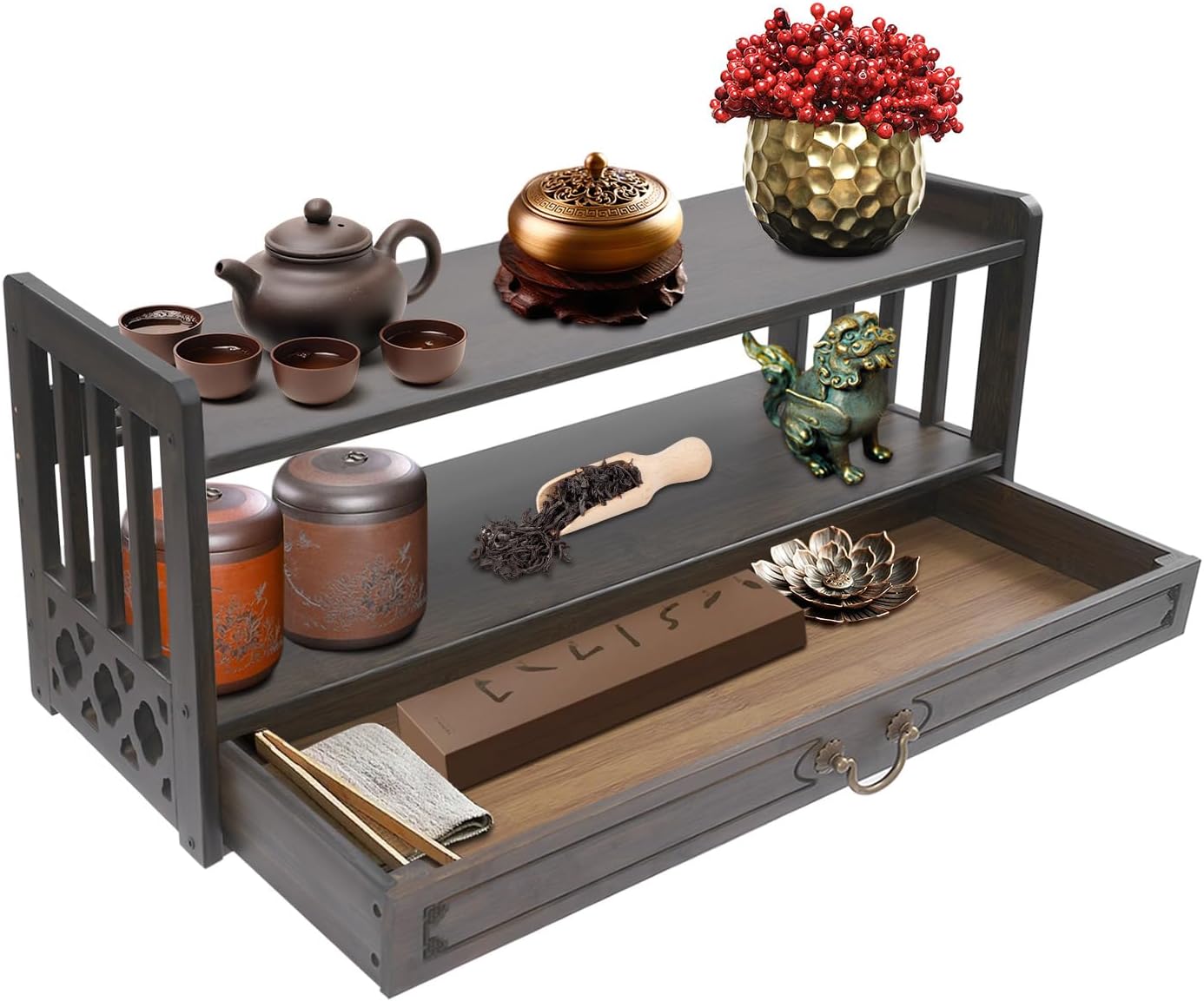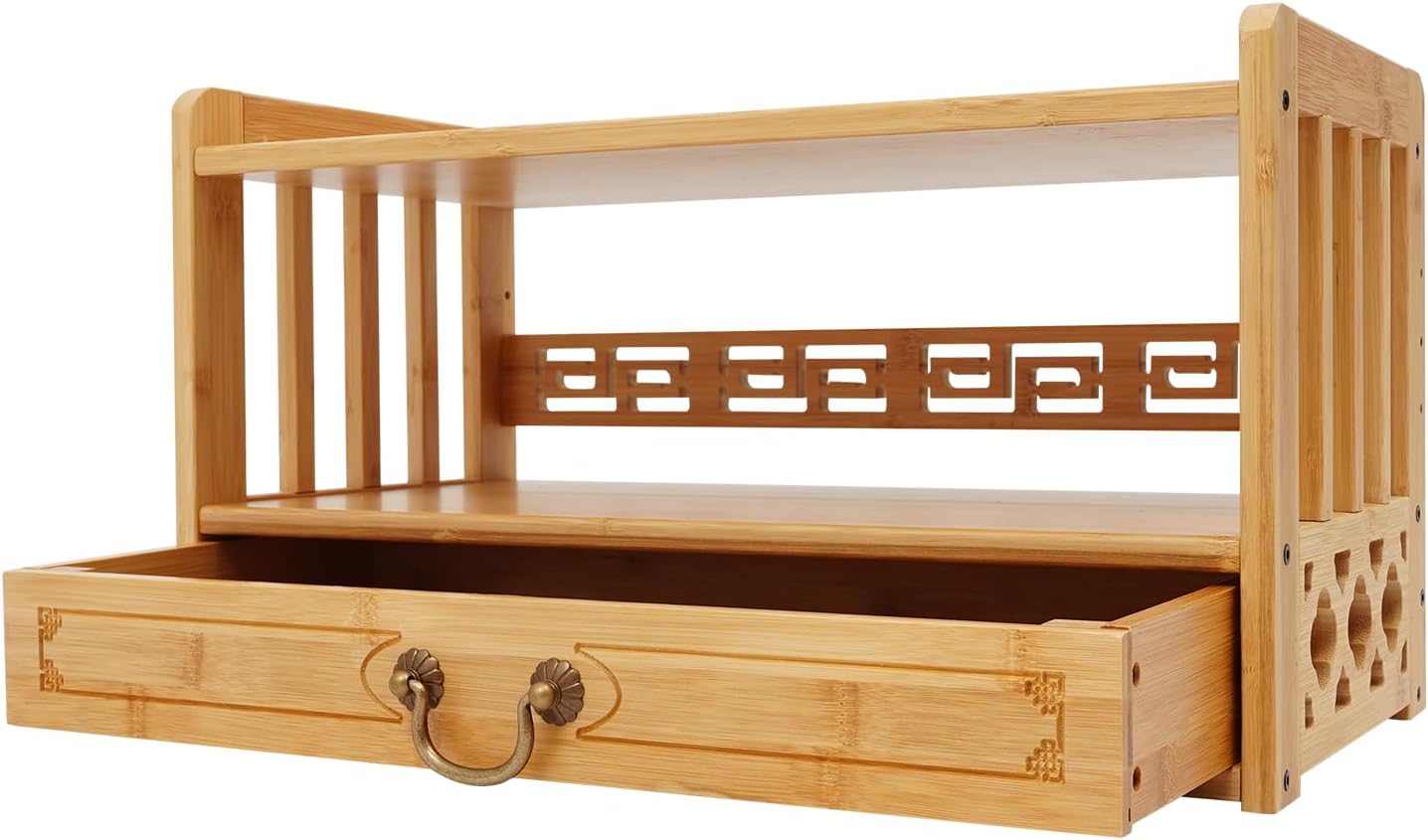 ApplicationIt can be used to hold Buddha statues, meditation bowls, teapots, books, and ritual items, great for meditation, prayers and rituals, and is widely used in living rooms, bedrooms, balconies, shrines, pantheons, and temples.SpecificationColor: Wood ColorShape: RectangularStyle: Chinese StyleMaterial: Bamboo, HardwareProcess: Spray PaintingAssembly Required: YesMount Type: FreestandingMax. Load Capacity: 25kg/55lbs(For Reference)Tier Spacing: 15cm/5.9in, 6cm/2.4inProduct Size: 52*25*28cm/20.4*9.8*11inPackage Size: 55*31*11cm/21.65*12.2*4.33inGross Weight: 3.3kg/7.28lbsNet Weight: 3.13kg/6.9lbsPackage Included1* Storage Table1* Assembly DiagramOther Accessories for AssemblyNotes1.Please check the style and size before purchasing.2.Please note that this product does not contain Buddha statues, tea tins, and other items.3.Please do not place items that exceed the maximum load capacity of the product.4.Please do not soak it in water or expose it to direct sunlight to prevent the product from cracking!