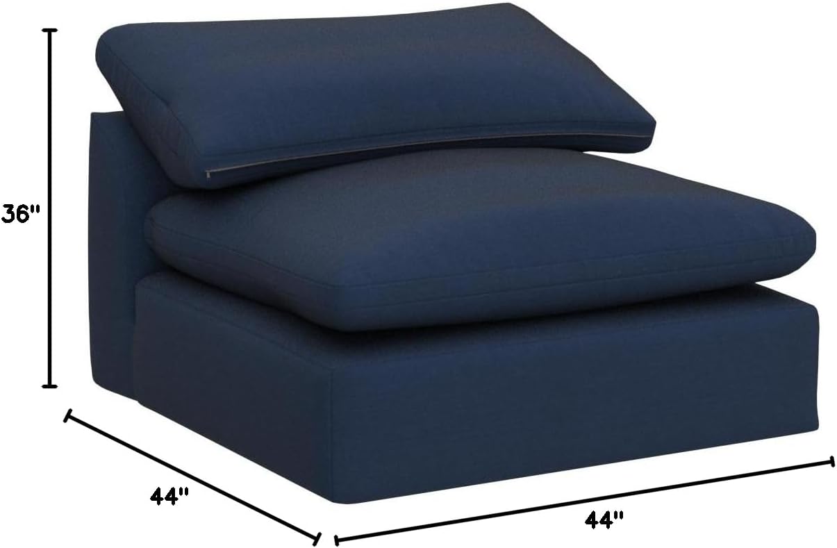 This contemporary modular sofa sectional armless accent chair is truly as comfortable as it looks. Enjoy unbelievably plush and cozy cloud-like comfort in your home, loft, office, or apartment with this cool configurable sectional piece. Perfect if you have a busy household, dogs, cats, children and parties, unexpected spills will roll off the washable soft pet-friendly and kid-proof performance fabric slipcovers. Changeable fabric slipcovers are available to completely update your living room vibe in a flash. Oversized seat and back cushions stuffed with goose down feather blend make this large deep-seating couch chair perfect for curling up in while the memory foam low frames are ideal to place in the center of your open space furniture arrangement. Feel free to sit on the comfortable backs, they go right back to the curved arm shape. So versatile, instead of a futon in your family room, dorm, spare bedroom or home office, feather pillow top seating supported by inner springs make this as cozy as a bed. Build your own left facing or right facing modular sofa, L-shaped couch, U-shaped or box pitt sofa, infinite configurations are possible. By adding additional corner modular pieces, armless modular chairs, and ottomans, all sold separately, you can create the ultimate laidback lounge that conforms to your room. This collection is simply the best family room furniture ever!