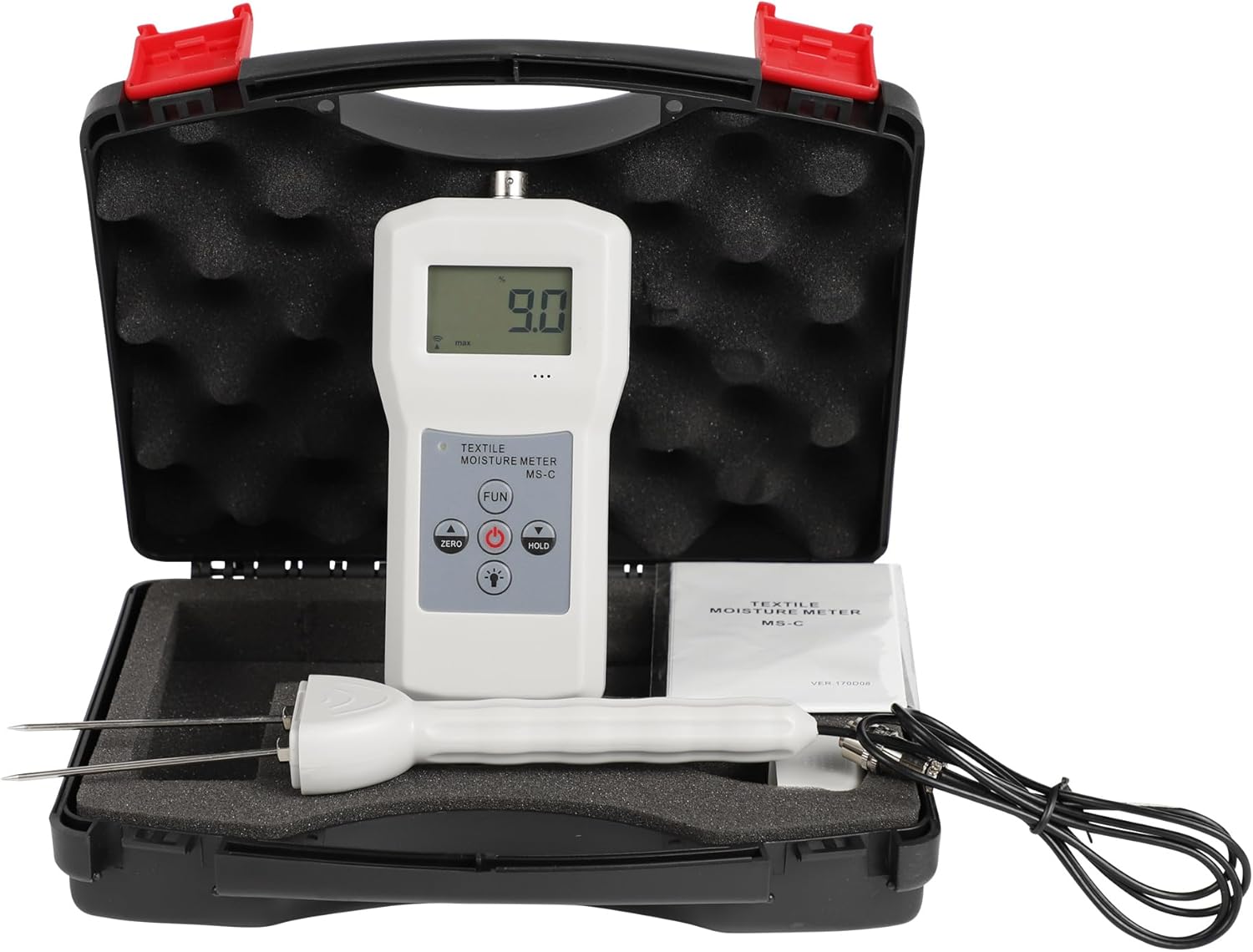 Textile moisture meter MS-C is used for measuring moisture content of textile materials,cheese,garment,wool. It appreicable of garment traders and other relevant industry. Specifications: Display:4 digital LCD Measuring range : 4-90%(CD01) Operating conditions: Temperature:0-60 Humidity:5%-90% Resolusion:0.1 Accuracy: ± 0.5(main moisture range) Power supply: 4x1.5 AAA size (UM-4) battery Dimensions: 140mm×60mm×22mm Weight: 119g (not including batteries) Guarantee:1 year Material Species:5 kinds optional Note: Due to shipping policy, the package does not include batteries