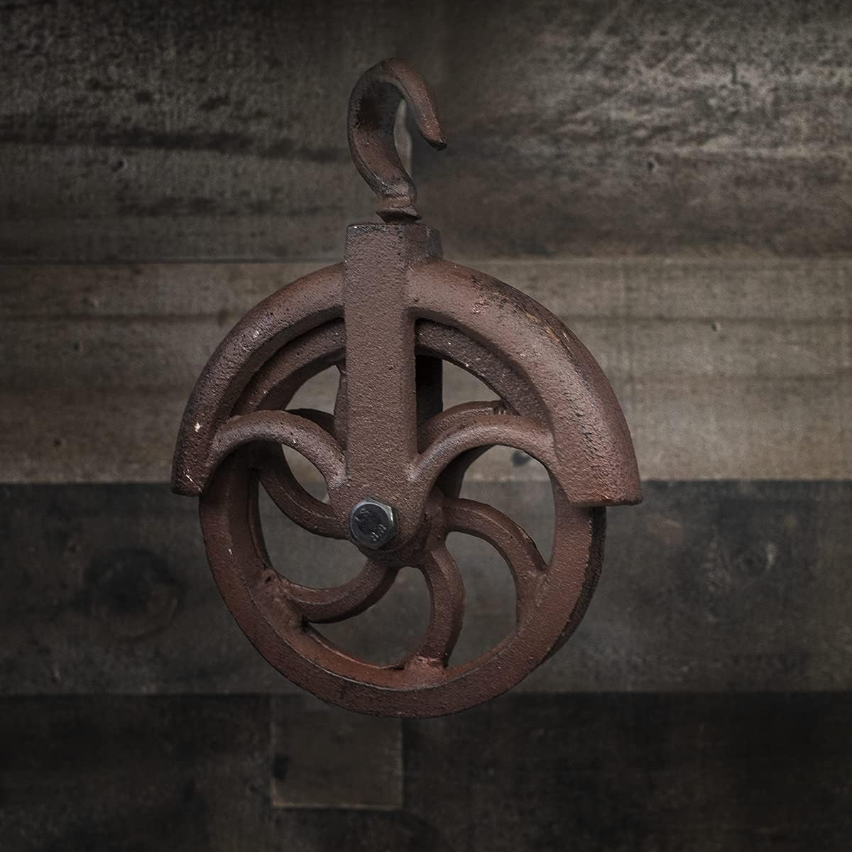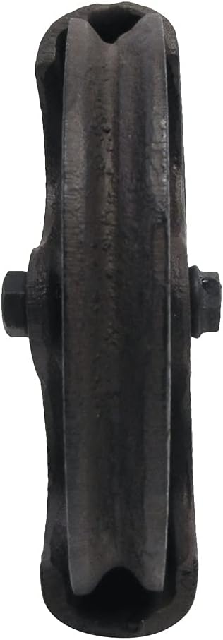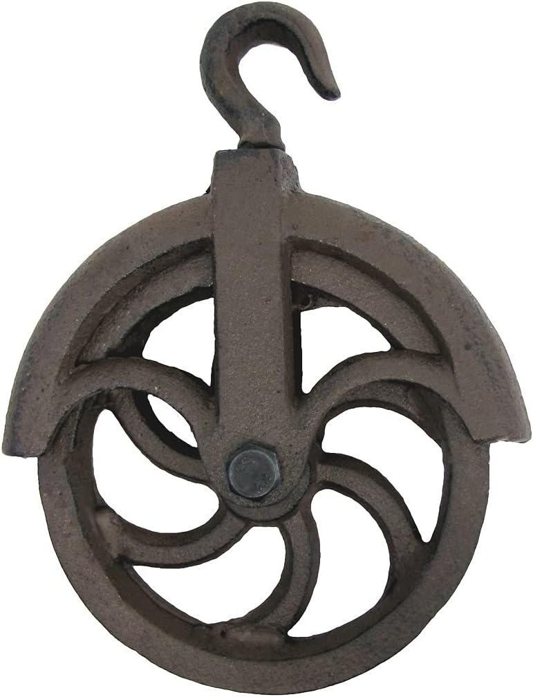 Add a rustic look to your country home with this metal cable pulley. Made entirely from heavy-duty cast iron, this antique-style pulley features a top hook, pulley wheel, and a groove where a cable would connect when used. A distressed, weathered finish makes this hanging decoration look like an antique relic. Use this pulley to add unique farmhouse decor and start conversations with guests and visitors or add it to your collection of antique memorabilia. Hang this antique-style cable pulley in your man cave or garage to add a unique touch to your decor. Give this decorative hanging pulley hook as a housewarming gift to friends and family members and get one for yourself. This farmhouse decor measures approximately 7 1/4" long, 5 1/2" wide, 6 1/4" wide, and 1 1/4" thick. As with all our items, this rustic pulley ships brand new with our 100% customer satisfaction guarantee. **PLEASE NOTE: This is not a functioning pulley and is only for decorative purposes.**