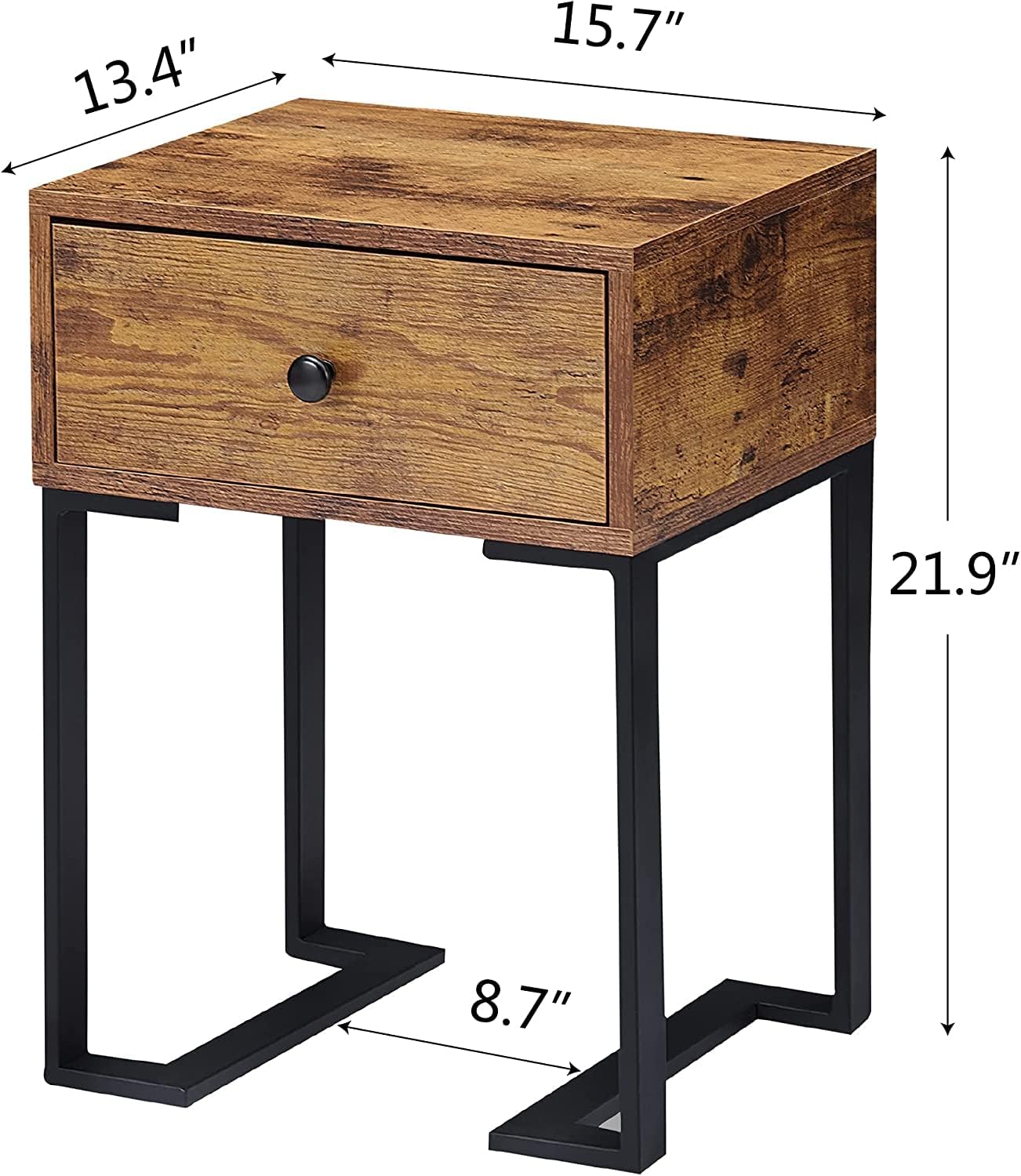 VECELO Industrial nightstand with natural wood grain gives brilliant decor to your living room / Bedroom. - Side Table with drawer provides sufficient storage to store magazines/books /or other accessories. - Metal Frame with rustic-style engineered wood which could hold up to 44lbs, ensure long-term service. Specifications: Weight: 17.64 lb (8 kg)Material: Particleboard, Steel Product Size: 15.7''L x 11.8''W x 21.8''H Load Capacity of Tabletop: 44 lb (20 kg) Load Capacity of Metal Shelf: 33 lb (15 kg) Package Contents: Instructions Allen Key